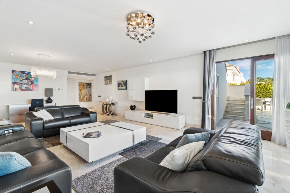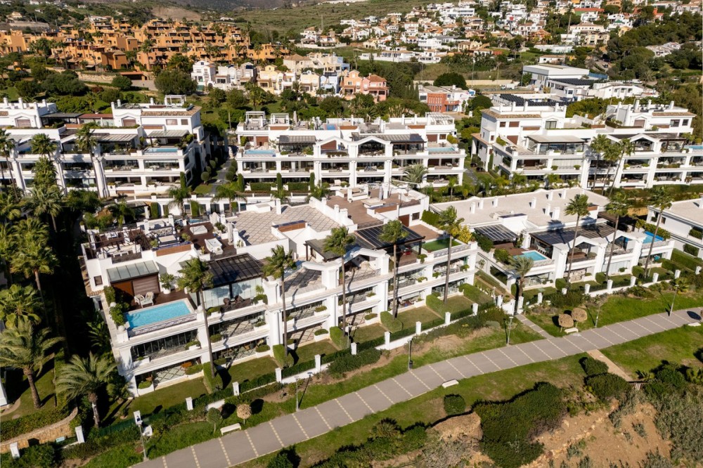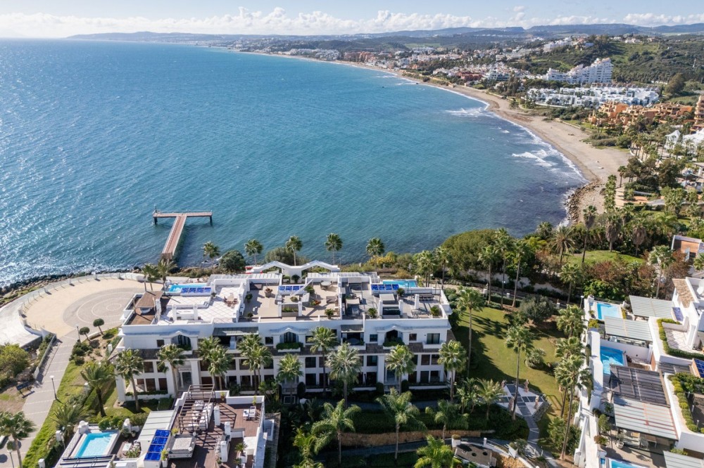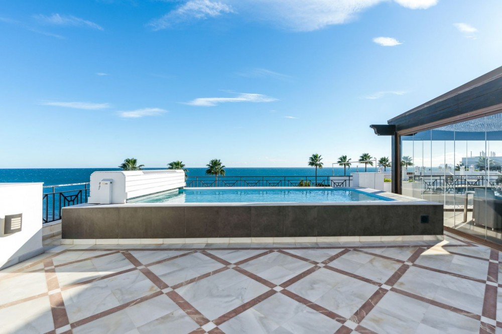 • We present an exclusive penthouse in a privileged seafront location with breathtaking panoramic views over the bay of Estepona, Gibraltar and the African coast. The scenery is magnificent throughout the day and offers breathtaking sunrises. The apartment has a spacious separate entrance which leads comfortably into a spacious living room, separate kitchen and guest toilet. From the lounge there is access to a large south facing terrace, ideal for sunbathing, with spectacular sea views and natural light throughout the day. The spacious rooms will make you feel on top of the world. There is also a private heated swimming pool for Mediterranean style swimming. The terrace leads to the first floor, where there is a spacious 186m² solarium with uninterrupted views of the mountains, Gibraltar and the port of Estepona, all bathed in the blue of the Mediterranean. Down the hallway from the entrance to the right are three bedrooms and the master bedroom with its own spacious en-suite bathroom with double sinks, bath, Jacuzzi and separate shower. All have fitted wardrobes. The layout of the bedrooms ensures total privacy by separating them from the living area. The master bedroom has direct access to the terrace with sea views. The property has underfloor heating and air conditioning to ensure maximum comfort all year round. It also has an advanced smart home system for easy remote management. This is a unique opportunity to acquire a penthouse in this exquisite complex and enjoy the lifestyle that comes with contemporary luxury construction qualities that make it a magnificent coastal retreat. The complex offers its owners a heated outdoor swimming pool, gymnasium, sauna and beautiful tropical gardens, as well as a privileged location close to restaurants, shops and the harbour. The complex has 24-hour security. Sold with double underground parking space and a large storage room.