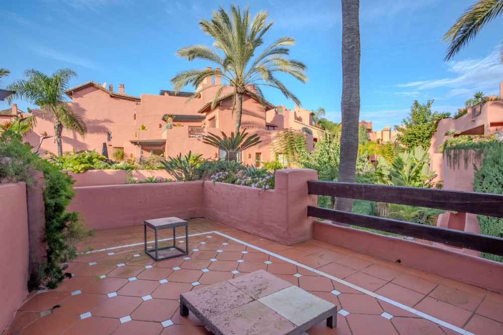 - Impressive three bedroom south facing duplex penthouse in the prestigious and gated beachfront community Menara Beach, Estepona. This sought-after complex has well-kept tropical gardens, outdoor communal swimming pool, indoor heated swimming pool and gymnasium, as well as being just ten minutes’ drive to Puerto Banus and a short drive to shops, restaurants and all amenities. The property has an open plan living and dining area with patio doors leading to two private terraces with beautiful sea views; fully fitted kitchen with separate laundry area; guest suite with access to the terrace; guest bedroom; and a guest bathroom. The upper-level leads to the impressive master suite with vaulted ceilings and a private terrace; on this level there is an additional large terrace with BBQ area and stunning views of the community and sea. Other features include fitted wardrobes throughout, marble floors, hot and cold air conditioning, underfloor heating in the bathrooms, private parking and store room.