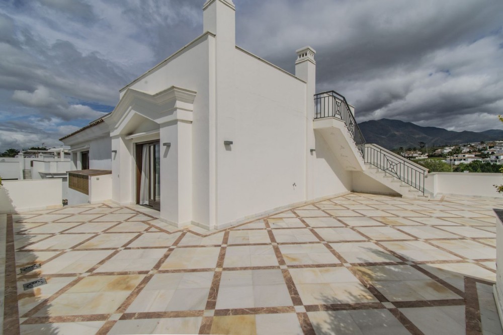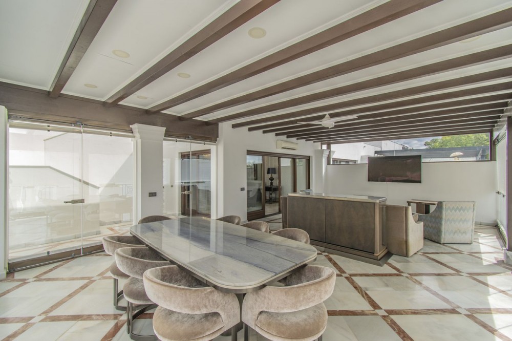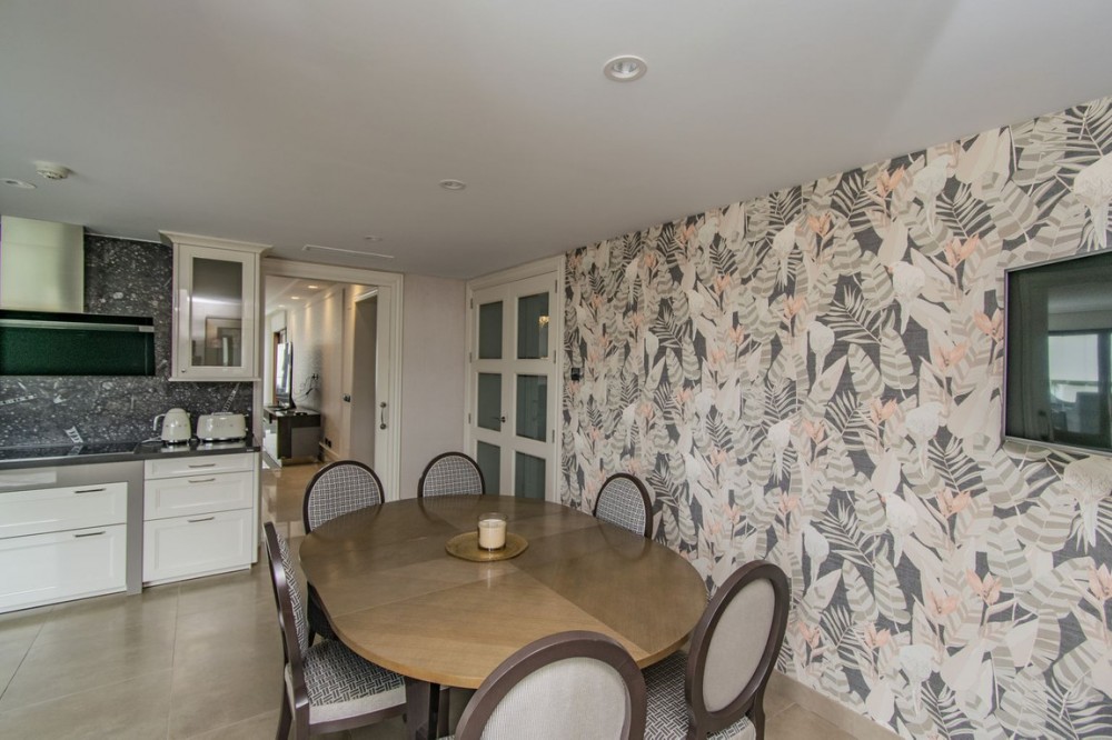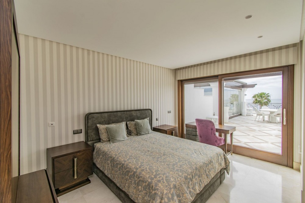 - UNIQUE BEACHFRONT PROPERTY WITH SEA VIEWS Spectacular luxury property with enormous terraces and stunning sea views, in a prime beachfront location in Estepona, just minutes from the port and surrounded by all kinds of amenities. This enormous penthouse, spread over two floors plus a solarium, offers a total of five bedrooms, five bathrooms plus a toilet, a large living room, a kitchen with a dining area, and enormous terraces with stunning sea views. Includes two parking spaces and a storage room. Located within a luxurious development with direct access to the beach, 24-hour security, swimming pools, a gym, a spa, etc. An ideal property for clients who want to enjoy a large beachfront property with sea views.