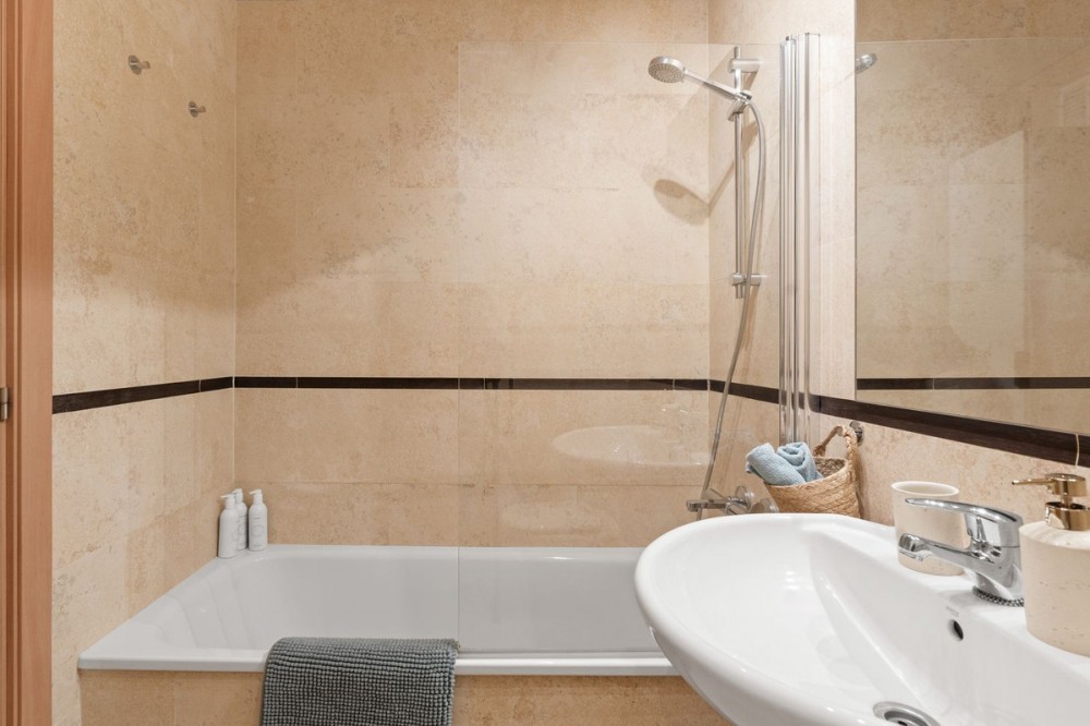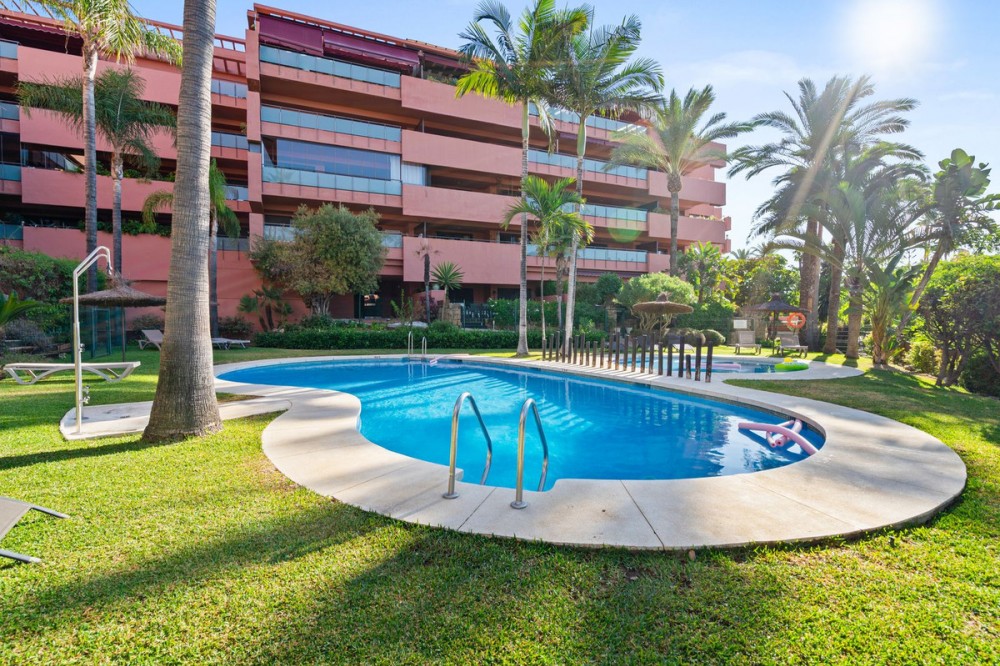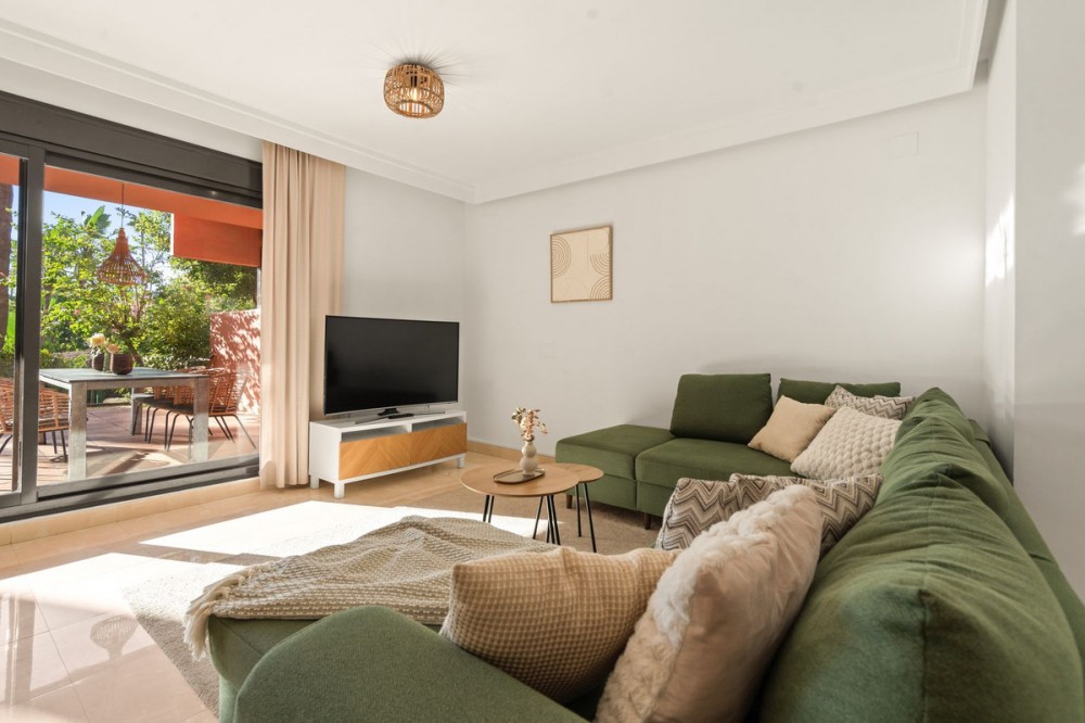- Ground Floor Apartment for Sale in the New Golden Mile Discover the perfect coastal retreat in this spacious ground floor apartment located on the sought-after New Golden Mile, just a stone's throw from the beach(100 meters). With a generous total area of 163 m², this property features two well-appointed double bedrooms and two large bathrooms, making it ideal for families or those seeking extra space. The exquisite living and dining room opens to two semi-covered terraces, perfect for enjoying the Mediterranean climate. Step outside to your private garden, complete with a staircase leading to lush communal tropical gardens. Enjoy the luxury of outdoor saltwater swimming pools and a range of complex amenities, including a gym, sauna, jacuzzi, and a large heated indoor pool. The apartment also includes a spacious kitchen, laundry room, and ample storage in the basement, along with a private garage space for your convenience. With a fantastic orientation to the east, this apartment is bathed in natural light throughout the day. Additional features include electric central heating, air conditioning, and built-in wardrobes. Located in a well-maintained urbanization with plenty of parking spaces outside, this property is a perfect blend of comfort and luxurity.
