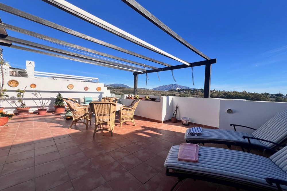 - Imagine waking up to the soft light of the Mediterranean streaming through the large windows of your living room. The best place to enjoy breakfast is outside on one of the three spacious terraces, which cover a total of approx. 90 square metres, while you take in the sea view and the tranquillity of the well-maintained Las Jacarandas residential complex in Bel Air. Whether you prefer sun or shade, there is always a place to suit the moment. The flat itself is ready to move into and exudes elegance. The spacious living room with marble flooring forms the heart of the apartment and leads directly onto the terraces. There are two bedrooms and two bathrooms, one of which is en suite. The bedrooms have built-in wardrobes. Everything is perfectly maintained and fitted with timeless materials, including lots of marble in the bathrooms with spacious showers. A particular highlight is the roof terrace with a storage room measuring approximately 30 square metres. This can easily be converted into an additional bedroom with shower, a studio or even a private sauna. From the underground car park, the lift takes you directly to the third floor - guaranteeing everyday convenience. The complex itself is excellently maintained and offers two beautiful swimming pools surrounded by well-tended gardens - a place where peace and relaxation take centre stage. The flat is sold fully furnished, so you can move in immediately. The location is ideal: officially, the complex belongs to Estepona, but in fact it is located exactly halfway between Marbella and Estepona, close to San Pedro de Alcantara. This allows you to enjoy the tranquillity of Estepona and at the same time be close to the liveliness of Marbella. In just 10 minutes you can reach the world-famous Puerto Banus marina with its luxury boutiques, exclusive restaurants and nightlife. Malaga Airport is only 65 km away, less than 45 minutes by car. The nearest beach, Playa Saladillo, is only 1 km away and offers charming beach bars for a meal or a drink. Supermarkets and shops are just a 5-minute walk away. There are 2 children's playgrounds and sports facilities in the immediate vicinity, as well as several golf courses - ideal for families or anyone who enjoys an active lifestyle. Estepona itself has become one of the most sought-after locations on the Costa del Sol in recent years. The historic old town with its flower-filled streets, the kilometre-long beach promenade, the lively harbour and the wide range of restaurants and cultural activities attract both international residents and visitors. Here, Andalusian charm combines with the comforts of a modern coastal town – and that is precisely what makes life here so desirable. This flat in Las Jacarandas is therefore more than just a home: it is an invitation to live the Costa del Sol lifestyle – with sea views, space, comfort and everything that makes the Spanish way of life so irresistible.