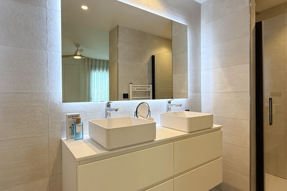- Fantastic luxury apartment located in the centre of Estepona, the garden of the Costa del Sol. This newly build apartment is conveniently situated within walking distance of the marina of Estepona , close to the romantic and vibrant old town and only 15 minutes walk from the beach of La Rada. Offering 2 bedrooms and 2 bathrooms. The main bedroom has an open plan bathroom with walk-in shower, anti-fog mirrors, electric towel racks and extra wardrobes. A fully equipped and open plan kitchen with all Bosch appliances and spacious living dining area. Carefully decorated in a perfect blend of Scandinavian minimalism, boho accents and ethnic touches. But more than that, it is the ideal place for outdoor living as there is also an oversized covered terrace that has been recently upgraded with glass curtains for maximum use of the terrace all year round and a very nice mediterranean garden with very low maintenance. The terrace has water and electricity pre-installation for an outdoor kitchen. The garden has sprinkler installation for automatic watering of the plants as wel as pre-installation for a jacuzzi. The domotic system for home automation is also installed to control the lights and electric blinds. Air conditioning and floor heating are provided though aerothermal energy. Also good to know is that the extra spacious utility room with washing machine and tumble dryer is just across the front door. A private underground parking space is also included in the price. The exclusive gated community offers a large outdoor pool and state of the art gym facilities, community area, game room and secure entrance. Alexia Life stands out for its architecture and design but also for the great community and is a must see if you are looking for the perfect holiday house or for all year round living.