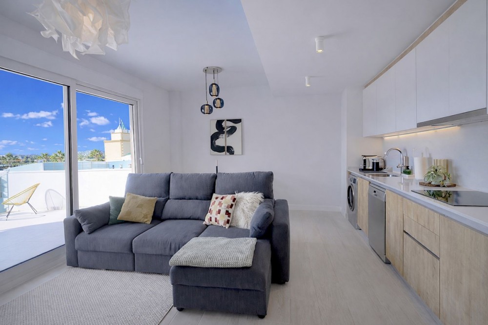 - Step inside this beautiful, brand-new 2-bedroom, 2-bathroom apartment right in the heart of Estepona, where modern comfort meets effortless Mediterranean living. From the moment you walk in, the space feels light, fresh, and welcoming. Large floor-to-ceiling windows flood the apartment with natural light, creating an easy flow between the stylish interior and the private terrace, perfect for morning coffee or relaxed evenings. The open, contemporary design is paired with porcelain flooring, fitted wardrobes, and sleek, fully equipped bathrooms that feel both practical and elegant. The apartment is finished to a high standard and comes fully furnished, ready to enjoy from day one. Climate comfort is ensured year-round thanks to an aerothermal system providing hot water and air conditioning, distributed discreetly through ducts in the living room, kitchen, and bedrooms, with a thermostat conveniently located in the lounge. Set within a modern residential complex, residents enjoy beautifully landscaped gardens, a children’s playground, and a fabulous communal swimming pool—a real oasis in the town center. The building also offers lift access, underground parking, and a secure gated entrance for peace of mind. Location-wise, it doesn’t get much better. You’re within walking distance to the beach, shops, schools, cafés, and restaurants, making everyday life refreshingly easy. Estepona itself blends traditional Andalusian charm with a cosmopolitan vibe, offering over 20 km of beaches, vibrant bars, excellent dining, and plenty of water sports. Plus, quick road access along the A-7 motorway connects you effortlessly to Marbella, Málaga Airport, and Gibraltar Airport. Whether you’re looking for a stylish permanent home, a lock-up-and-leave holiday retreat, or a smart investment, this top-floor contemporary apartment ticks all the boxes—modern, central, and ready to enjoy.