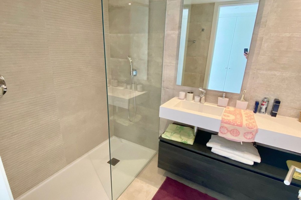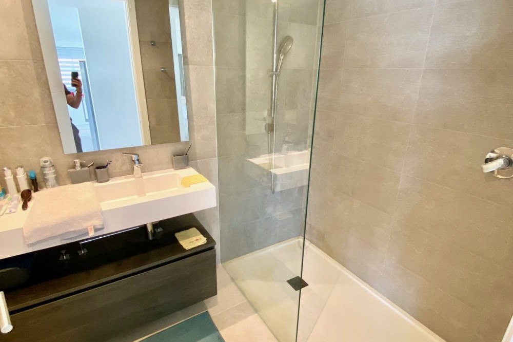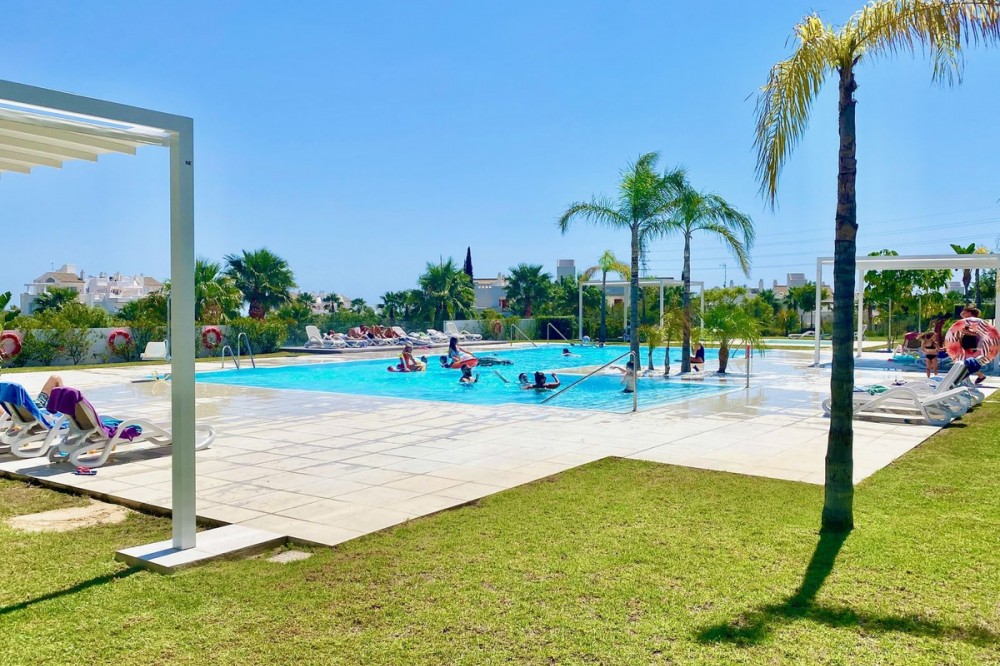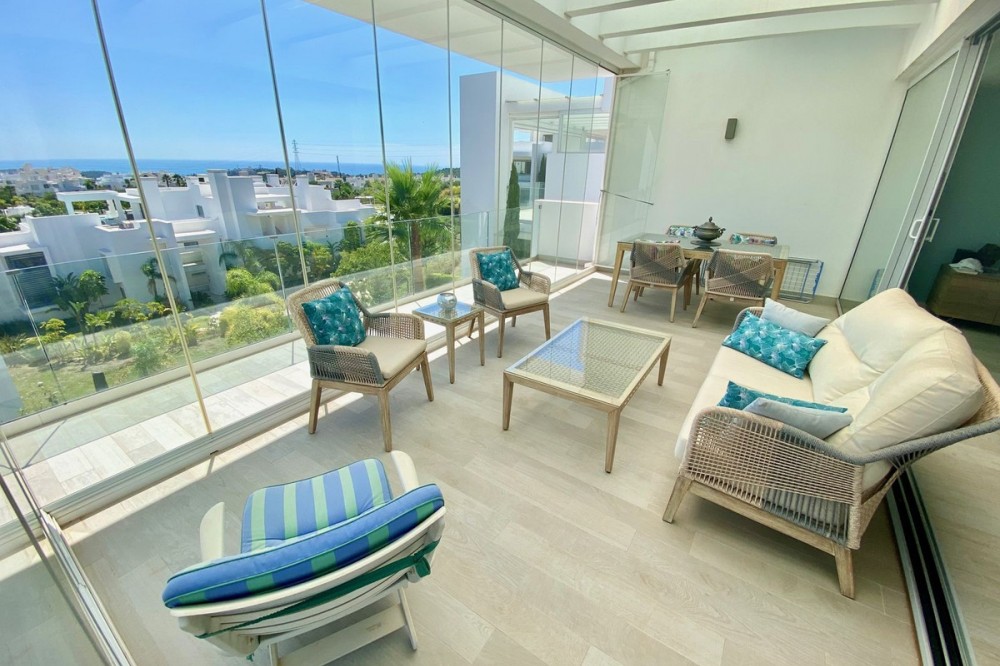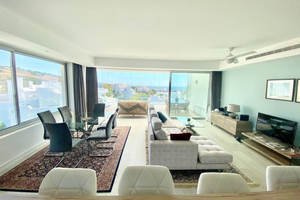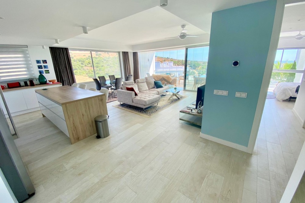 - Love at first sight! Large 3 bedroom corner unit in a paradise environment, yet 5mn to all amenities/golf/sea, and the town of Estepona. Situated in the most elevated and private bloc, phase 3 of Alcazaba Lagoon, your senses awaken as you enter, thanks to the wonderful light and layout. The urbanisation is state-of-the-art, with all the amenities you can think of: a private laguna where owners can do all kind of water sports, or relax in one of the white sand beaches; a mediterranean restaurant and a beach bar; a gym and mini market; jacuzzi and sauna; and of course swimming pools, a massive garden, and hiking trails. The size of the living room is really spectacular, and the extensive fully-equipped open kitchen blends in perfectly. The 44m2 wrap around terrace has open views towards the sea and garden on one side, and to the Estepona mountains and a protected agricultural land on the other. The owner has installed glass curtains to create a chill-out area, which can be opened or closed. The sleeping area consists of 3 wide bedrooms (one has been converted to an office), and 2 full size bathrooms. The owner has just finished a substantial renovation and refurbishment, including a brand new kitchen, ventilators, terrace, furniture, custom-made curtains ... Ready to move into. The price comes with two underground private parking spots, and a huge fitted storage room. A must see!!