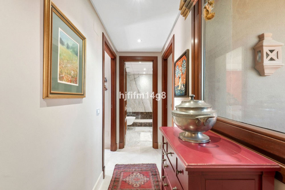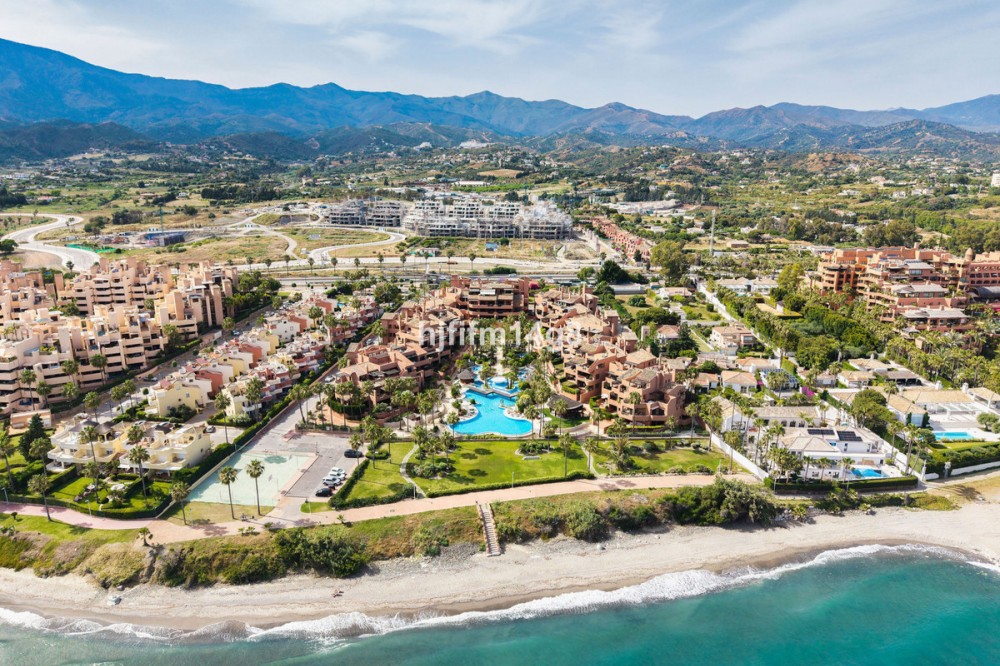 - This exceptional 3-bedroom penthouse in Mar Azul, Estepona, offers a luxurious coastal lifestyle, combining elegance, comfort, and breathtaking sea views. Located on the sought-after New Golden Mile, Mar Azul is a prestigious beachfront urbanization next to the renowned Kempinski Hotel. Residents enjoy direct beach access and are just minutes from high-end boutiques, cafés, and restaurants. The charming Estepona town centre is only a 5-minute drive away. Just ten-minutes walk to luxurious Laguna Beach with several restaurants. One of the standout features of this unique penthouse is that it is built entirely on one level, offering ease of living and a seamless flow throughout the home. The highlight is the unusually large southwest-facing terrace, accessible directly from the living room. This expansive outdoor space includes a lounge area, space for sunbeds, and a glazed corner dining area that can be opened or closed depending on the season — ideal for year-round use and entertaining. Additionally, the apartment and terrace are equipped with 8 integrated Sonos speakers, providing premium-quality sound throughout. Inside, the property welcomes you with a bright and spacious open-plan living and dining area, bathed in natural light through floor-to-ceiling glass doors. The refurbished modern, fully fitted kitchen is equipped with high-end appliances, offering both functionality and style. Underfloor heating and aircondition in all rooms. There are three generously sized bedrooms, one of them in-suite and the other two sharing one bathroom. Providing comfort and privacy for family and guests alike. Two of the bedrooms has directly access to separate outdoor space. Additional features include two underground garage spaces, ensuring secure parking and two store rooms. From the garage there is an elevator with direct access to the entrance of the apartment. Interior 112m2, plus terrace 72 m2. The community of Mar Azul offers resort-style amenities, including several outdoor swimming pools, an indoor heated pool, a fully equipped gym, spa, and sauna. The complex is gated with 24-hour security, ensuring peace of mind and an exclusive living environment. This remarkable penthouse, with its rare single-level layout, expansive terrace, and unbeatable southwest orientation, represents a rare opportunity to enjoy true beachfront luxury between Marbella and Estepona.