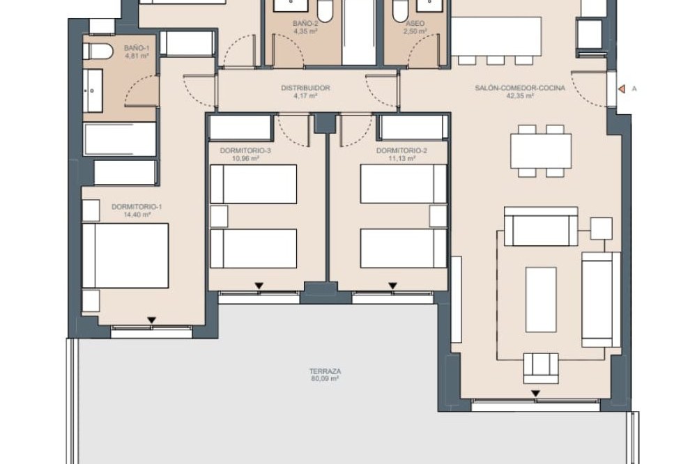 - Located in Las Mesas, one of the most sought-after and rapidly expanding residential areas in the city of Estepona, this elegant elevated ground floor apartment combines contemporary design, comfort, and a privileged location. Just a 10-minute walk from the Port and the beach, and 20 minutes from the charming old town, it offers a unique opportunity to enjoy the Mediterranean lifestyle with all amenities within easy reach. The property stands out for its impressive private terrace of 80 m², south-facing to make the most of natural light throughout the day and offering pleasant lateral sea views. Ideal for those who value spacious outdoor areas, whether to relax, entertain guests, or enjoy the climate year-round. Inside, the apartment is distributed into 4 spacious bedrooms with built-in wardrobes, 2 full bathrooms with top-quality materials, and an additional guest toilet for greater functionality. The living and dining areas integrate perfectly with both the terrace and the kitchen, which is modern, open-plan, and fully equipped with Siemens appliances, Silestone countertops, and a laundry room with drying area. A peninsula will soon enhance the kitchen. The finishes have been carefully selected: porcelain stoneware floors, white lacquered doors, exterior carpentry with double glazing, and motorized shutters in the living room and bedrooms. Additionally, it features ducted air conditioning with independent control, aerothermal system for hot water, and mechanical ventilation to ensure maximum comfort and energy efficiency throughout the year. The apartment includes 2 underground parking spaces and a large storage room, all within a gated complex that offers security and peace of mind. The development, built in 2025, offers unbeatable communal areas: adult and children's swimming pools, fully equipped gym, sauna, landscaped gardens, bicycle area, and accessible entrances for all residents. The building has an elevator and universal accessibility. A perfect property both as a permanent residence and as a secure investment in one of Estepona’s most promising areas.