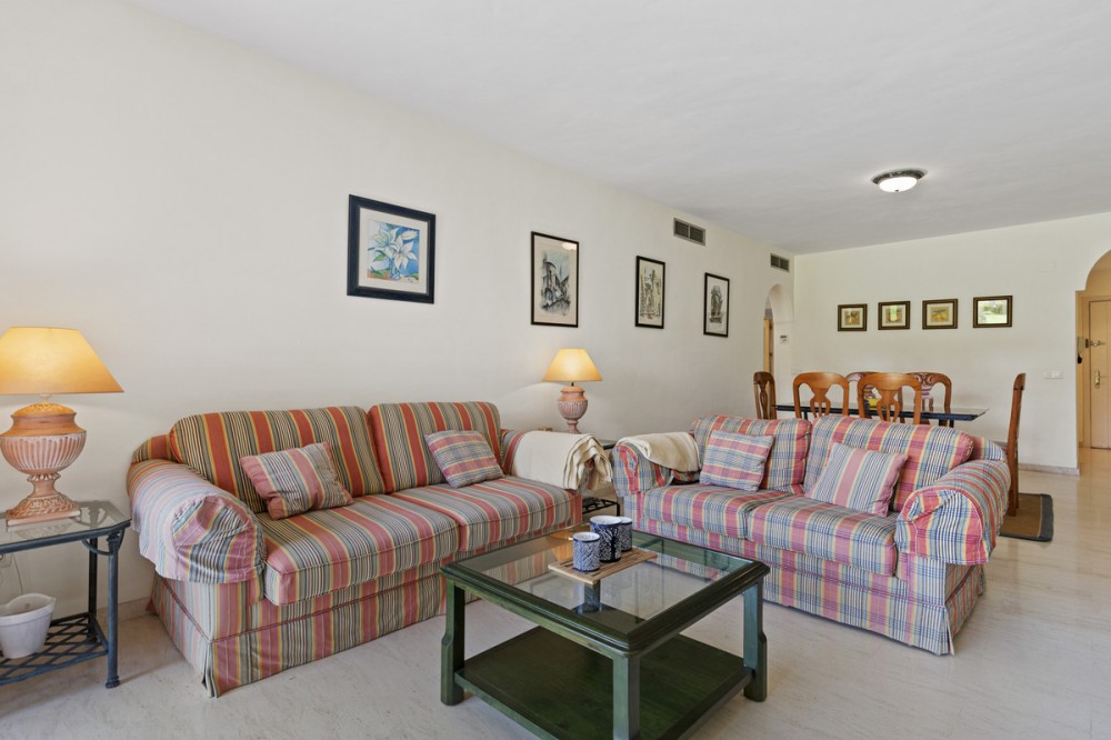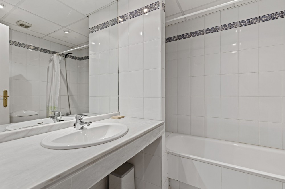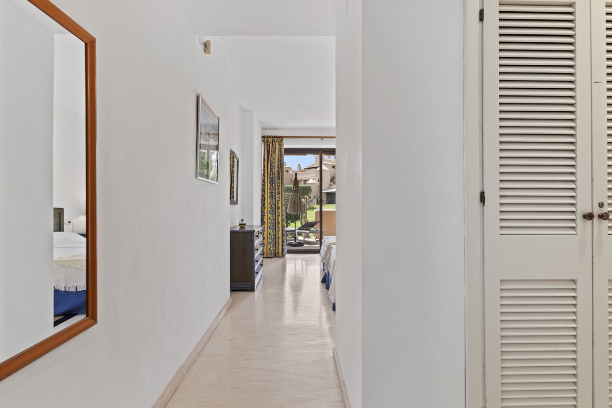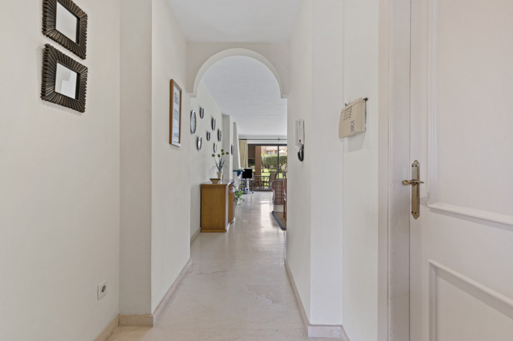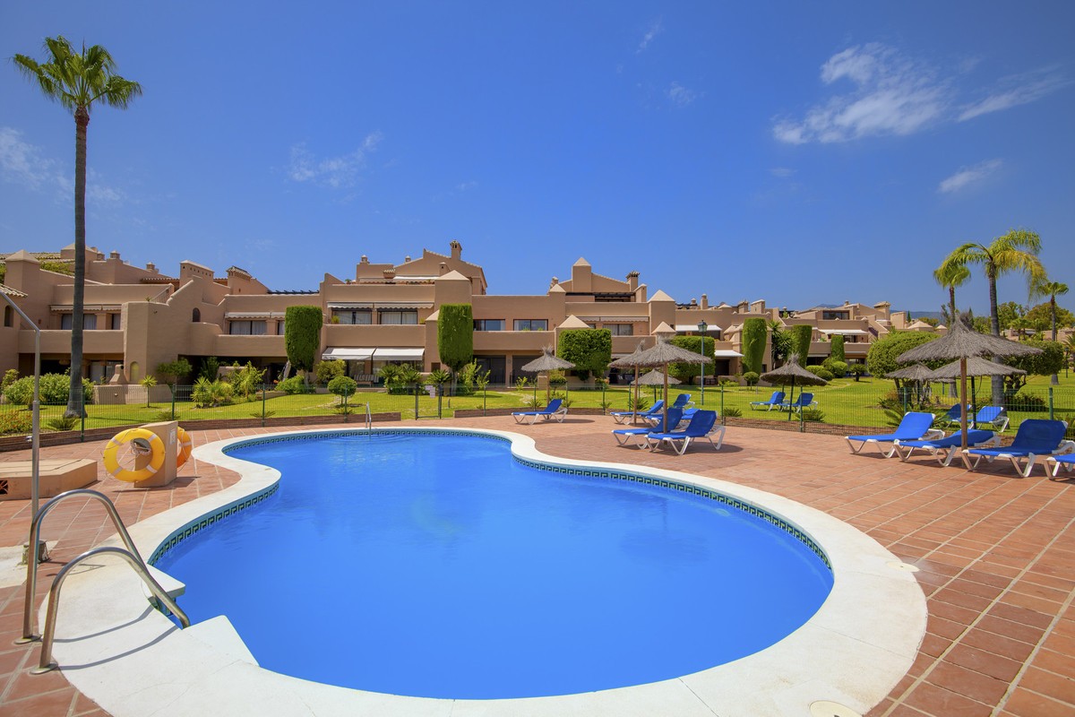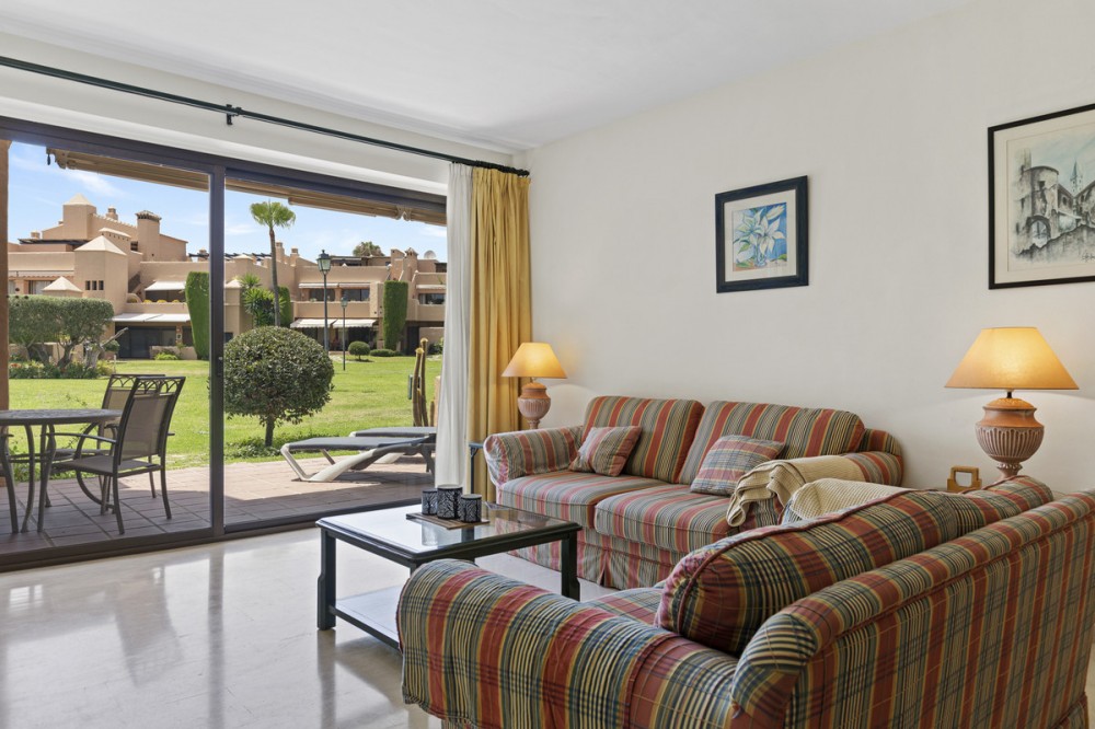 - Located within a very pleasant, secure residential community offering 24/7 security, this beautifully presented apartment combines comfort and resort-style amenities. Residents enjoy access to three swimming pools, tennis and paddle tennis courts, and beautifully maintained mature gardens. The apartment features two generously sized bedrooms, both with en-suite bathrooms and fitted wardrobes. The master bedroom opens onto a sunny, covered terrace that overlooks the communal gardens and pool—perfect for relaxing or entertaining. The second bedroom offers added charm with a Juliette terrace, allowing natural light and garden views to flood the space. Inside, the apartment is bright and inviting, with air conditioning throughout for year-round comfort. The spacious living area provides direct access to the terrace, garden, and pool area, enhancing the sense of indoor-outdoor living. An exterior awning offers shade on sunnier days, extending the use of the terrace. Additional features include communal parking, direct access to recreational facilities, and a sun-drenched layout that makes this apartment a true gem in one of the area’s most sought-after communities.