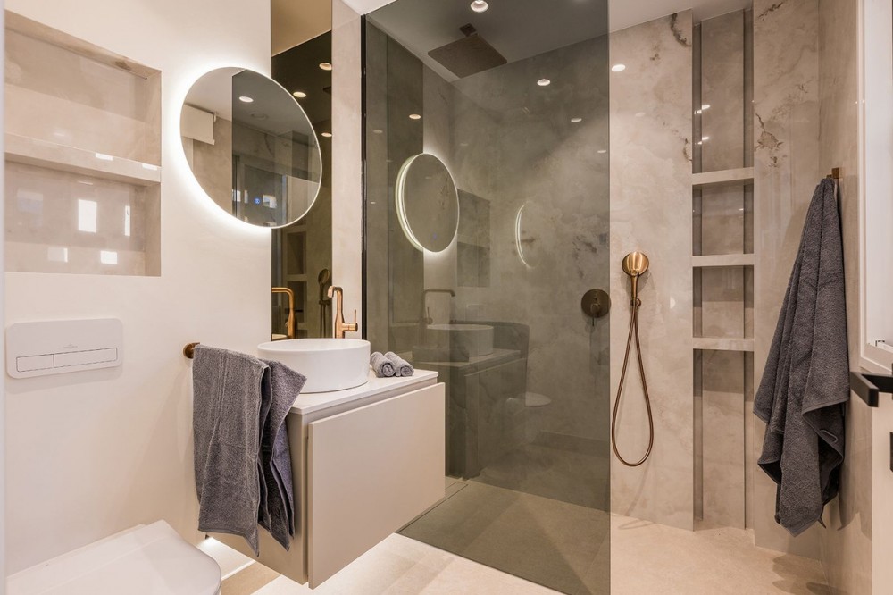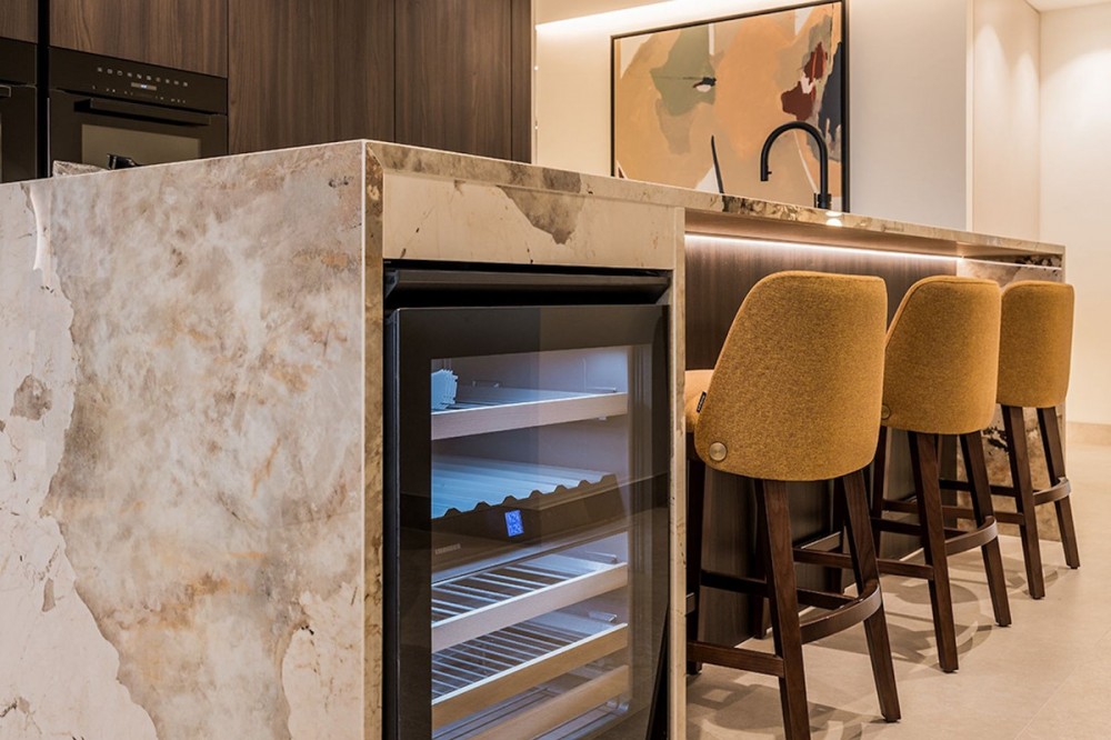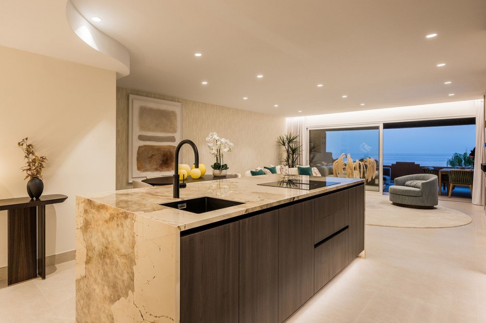 - This fully remodelled 4 bedroom and 4 bathroom apartment is an amazing opportunity for people who are looking for luxury and comfort in a stunning beachfront location. The spacious living and dining room and the luxurious master bedroom with its en-suite bathroom and walk-in wardrobe both have direct access to the impressive south facing terrace with panoramic sea views. Los Granados del Mar is one of the most exclusive urbanizations on the New Golden Mile with breathtaking views of the Mediterranean Sea. Its combination of beautifully maintained gardens and luxurious facilities such as an on-site restaurant, a heated indoor pool, 2 outdoor pools, a gym, a sauna, a Jacuzzi and 24h security make this community one of a kind. It has direct beach access and is very close to all amenities, shops, schools, high class restaurants, the newly build Laguna complex and the center of Estepona. This bright 187 m² apartment boasts a brand-new open-concept designer kitchen with premium German appliances and luxurious extras, including a Bang & Olufsen sound system, an electric fireplace, and a freestanding bathtub. Underground parking with direct lift access to the apartment as well as a secure storage room are included in the price.