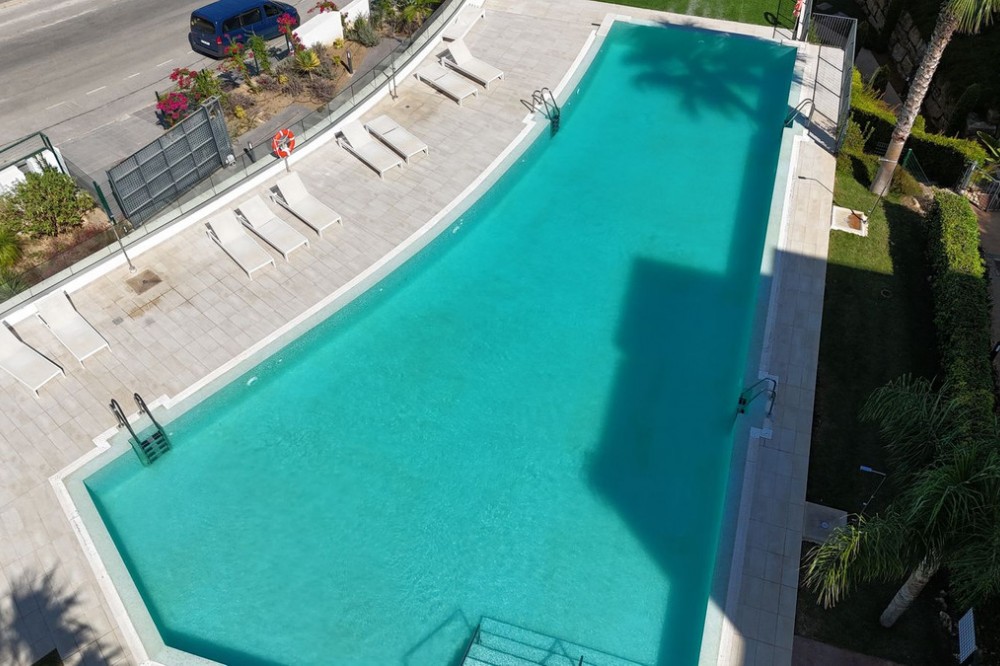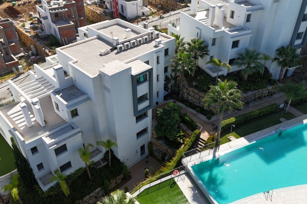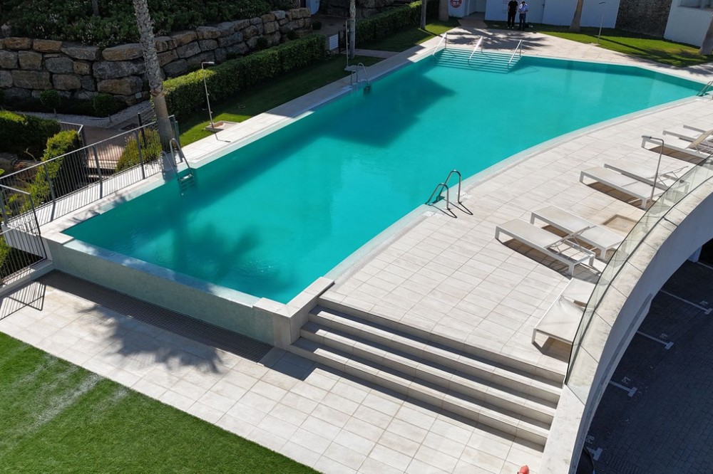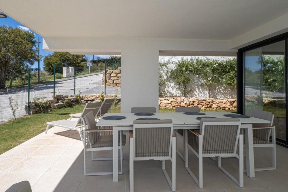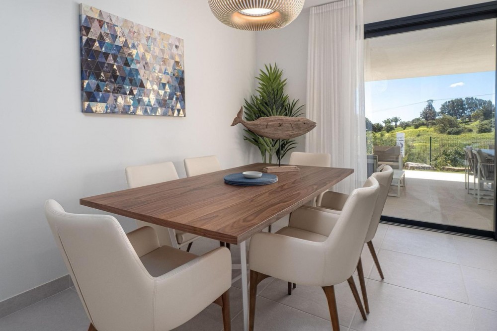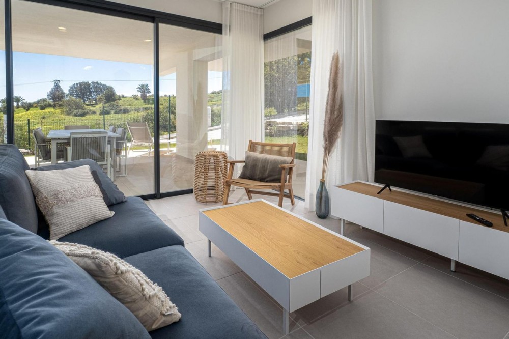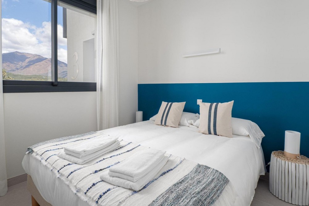 - Exclusive Nearly New 3 Bedroom Apartment in Mirador del Golf – ESTEPONA Welcome to this exceptional ground-floor corner apartment, delivered in 2022, located in the prestigious Mirador del Golf complex in Estepona. A true prime location, just steps away from several renowned golf courses, the exotic Alcazaba Lagoon, and Estepona’s new hospital. Here, luxury, comfort, and accessibility come together in perfect harmony. The complex itself radiates elegance and sophistication: only 54 apartments spread over 6 modern buildings, carefully integrated into the natural slope of the terrain on an 8,400 m² plot. With its contemporary architecture, southeast to southwest orientation, and panoramic views of Estepona Golf, the mountains, and the Mediterranean Sea, Mirador del Golf offers a unique living environment. This spacious apartment boasts 125 m² of built living space, an impressive 51 m² sun-drenched terrace, and a private garden of 95 m², beautifully landscaped with a lawn maintained by the community. Thanks to its corner position and oversized windows, it enjoys abundant natural light and breathtaking views of the sea, the Sierra Bermeja mountains, and the swimming pool. Inside, the apartment is tastefully decorated and fully furnished, featuring high-quality finishes throughout. The open-plan kitchen with a striking central island is fitted with top-quality Siemens A+ appliances. The bright and airy living and dining area flows seamlessly to the terrace and garden through three large sliding doors – blending indoor and outdoor living in true Mediterranean style. The master bedroom comes with a private ensuite bathroom with walk-in shower and built-in wardrobes, and offers direct views of the terrace and garden. The two additional bedrooms, both with fitted wardrobes and beautiful views of the Sierra Bermeja mountains and pool, share a stylish second bathroom with bathtub. A separate utility room next to the kitchen houses the washing machine and provides additional storage space. Residents of Mirador del Golf benefit from excellent community facilities, including a large 25-meter infinity pool and beautifully landscaped tropical gardens, and a fully equipped gym. The property also includes a spacious underground parking space and a private storage room of over 10 m² with electricity, perfect for charging e-bikes or as extra storage. Naturally, the apartment is equipped with all modern and eco-friendly features: central hot/cold air conditioning, LED lighting, alarm system, smoke detectors, double glazing, and an energy efficiency rating of B. Adding even more value, this property comes with a short-term rental license, making it highly attractive as both a holiday home and an investment, offering excellent rental returns. In short: this is a top-quality apartment in a prime location, combining the charm of the Costa del Sol with the comfort of modern living. Keys are available at our office – don’t miss the opportunity to view this outstanding property for yourself!