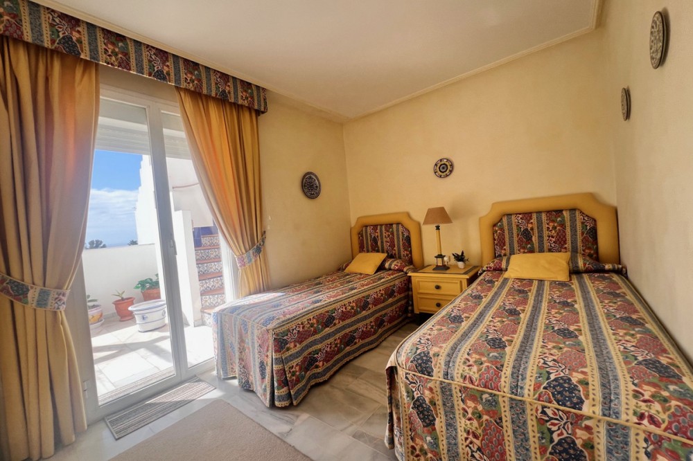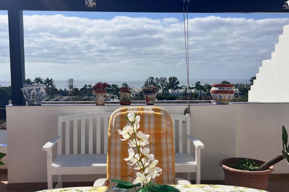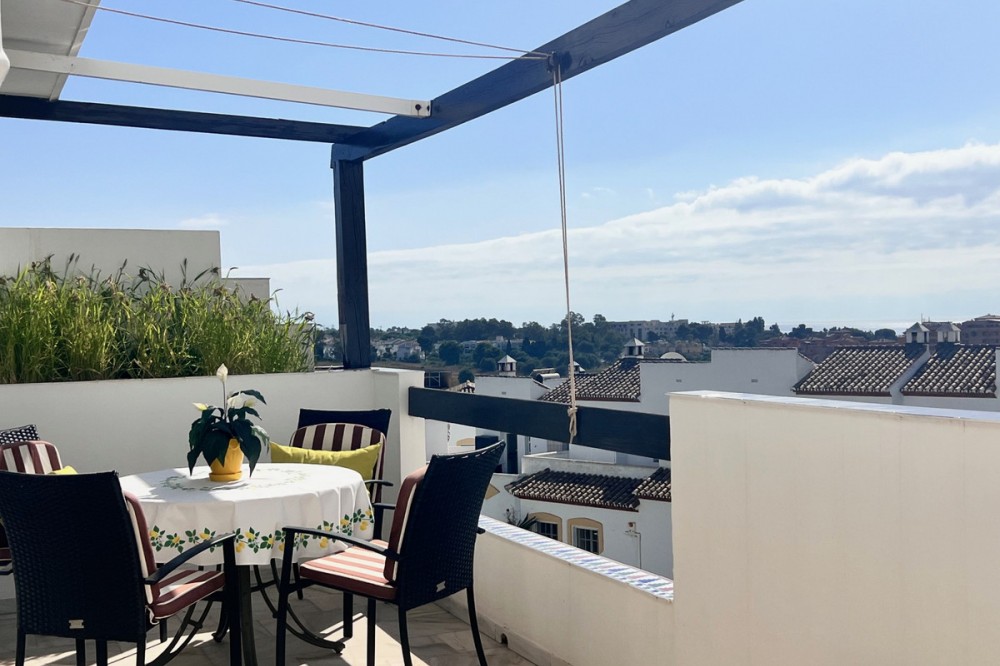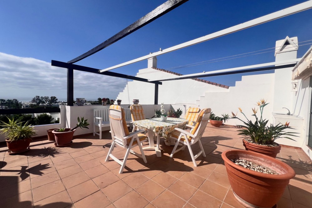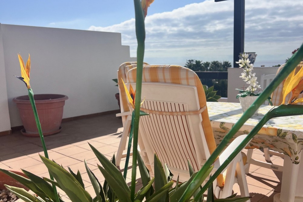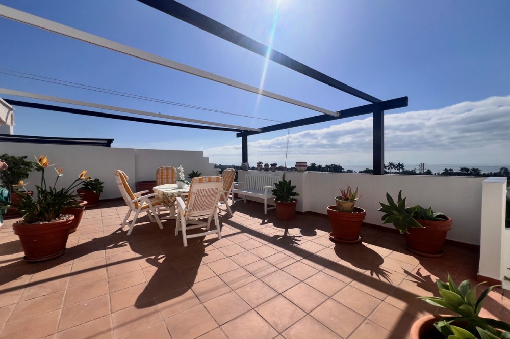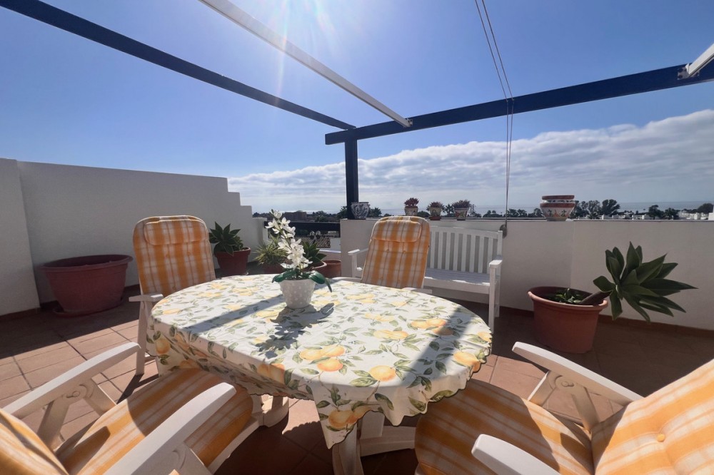 • This beautiful penthouse is located in the quiet and well-kept residence Las Jacarandas in Bel Air, within walking distance of supermarkets such as Mercadona and Lidl, and a short distance from Costalita beach. The house has a bright living room with direct access to a south facing terrace, from where you already enjoy a beautiful sea view. Via a staircase you reach the spacious roof terrace, where you will be treated to a spectacular panoramic view: on one side the Mediterranean and on the other the Sierra Bermeja and the iconic mountain La Concha. At this solarium there is also a practical storage room. The penthouse offers 2 bedrooms and 2 bathrooms, as well as a fully installed kitchen with access to a cozy terrace overlooking the lush communal gardens and pool. An underground parking lot is included. The residence is very quiet and security is provided in the evening. Holiday rentals are not allowed, making this the ideal place for those looking for peace, comfort and security, yet wanting to live close to all amenities.