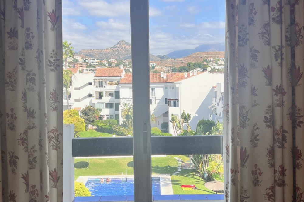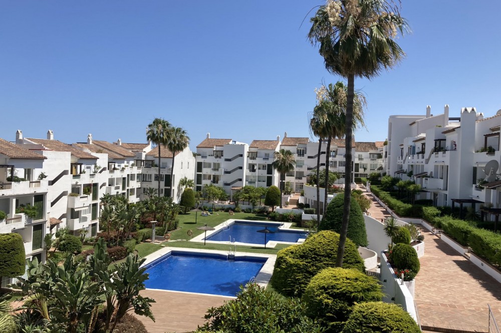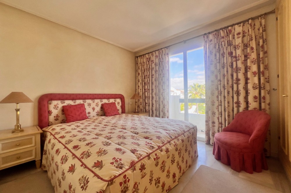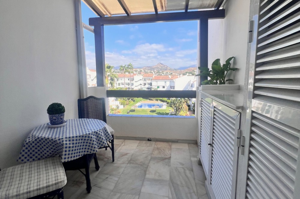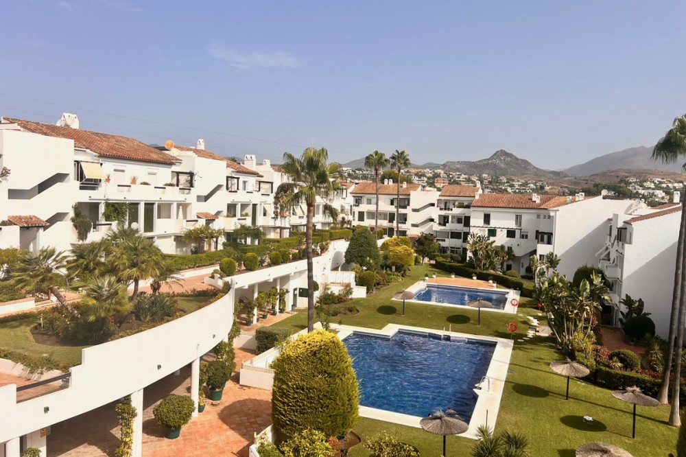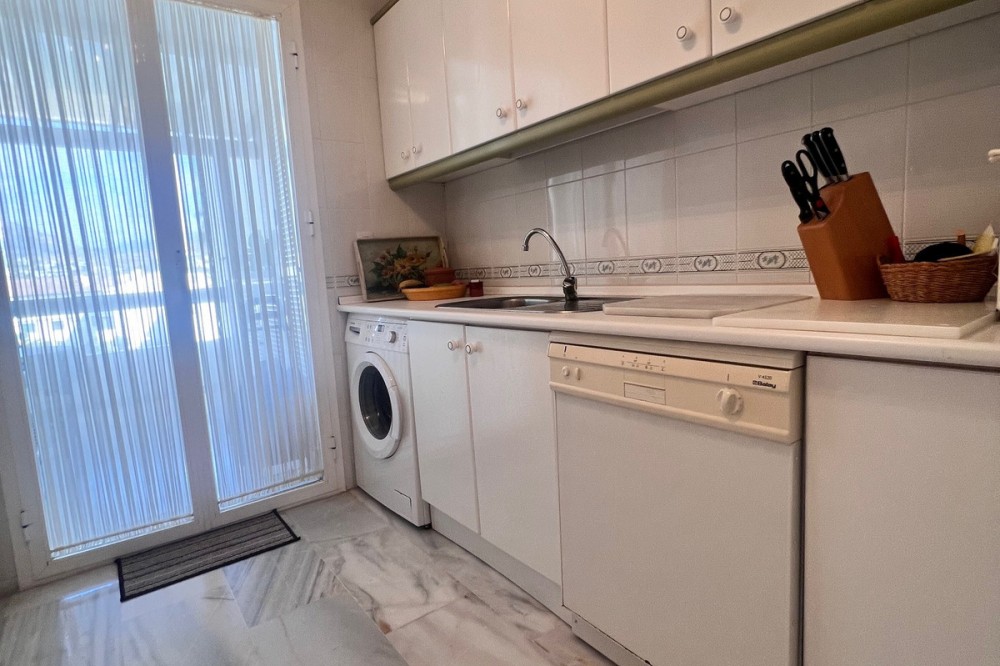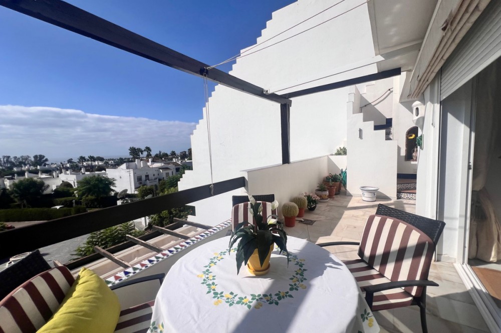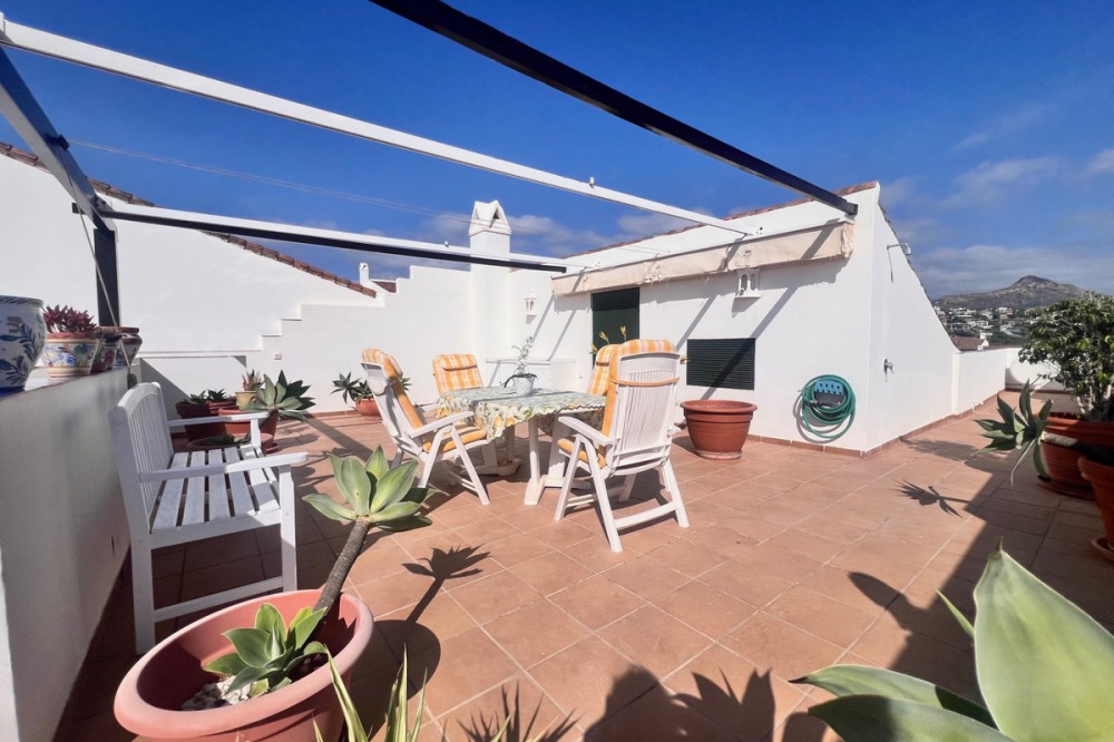 • This beautiful penthouse is located in the quiet and well-kept residence Las Jacarandas in Bel Air, within walking distance of supermarkets such as Mercadona and Lidl, and a short distance from Costalita beach. The house has a bright living room with direct access to a south facing terrace, from where you already enjoy a beautiful sea view. Via a staircase you reach the spacious roof terrace, where you will be treated to a spectacular panoramic view: on one side the Mediterranean and on the other the Sierra Bermeja and the iconic mountain La Concha. At this solarium there is also a practical storage room. The penthouse offers 2 bedrooms and 2 bathrooms, as well as a fully installed kitchen with access to a cozy terrace overlooking the lush communal gardens and pool. An underground parking lot is included. The residence is very quiet and security is provided in the evening. Holiday rentals are not allowed, making this the ideal place for those looking for peace, comfort and security, yet wanting to live close to all amenities.