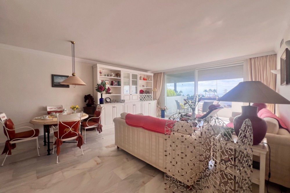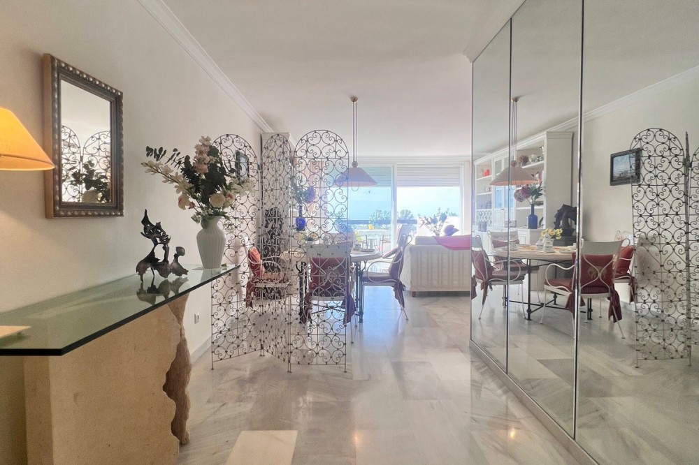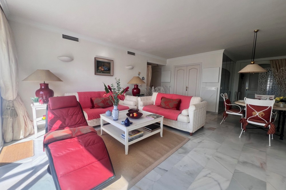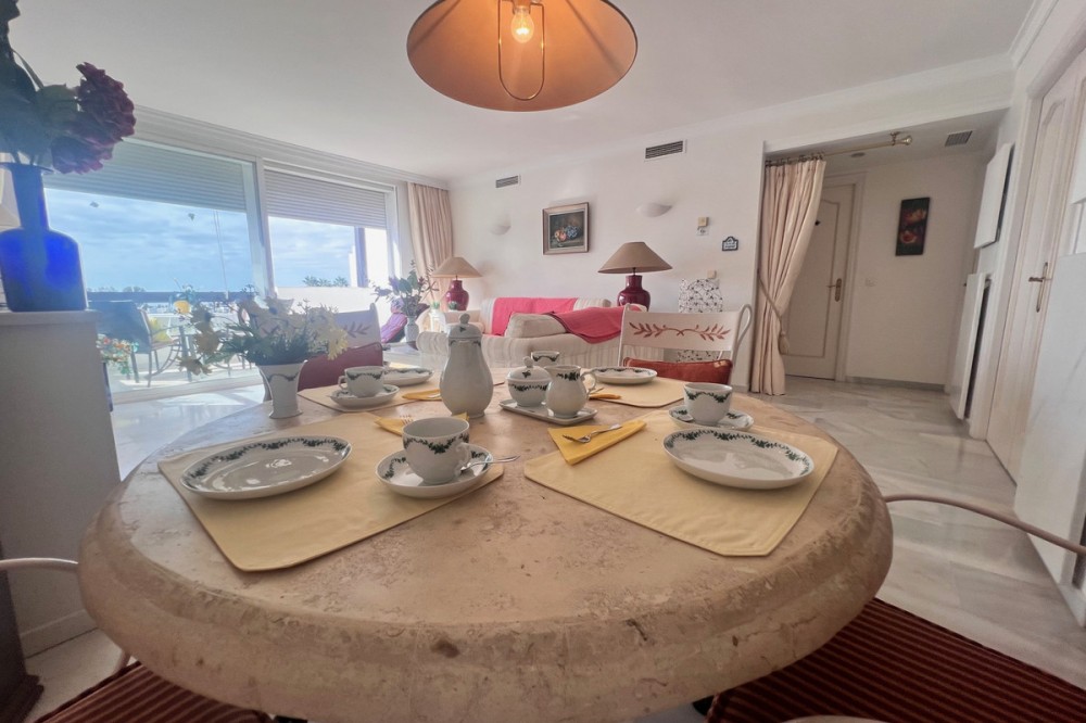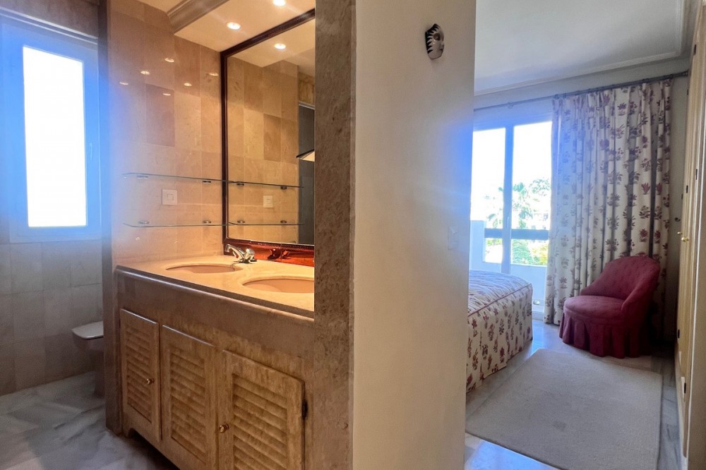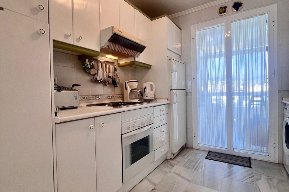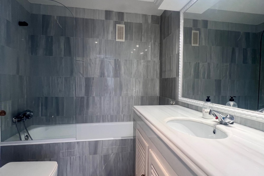 • This beautiful penthouse is located in the quiet and well-kept residence Las Jacarandas in Bel Air, within walking distance of supermarkets such as Mercadona and Lidl, and a short distance from Costalita beach. The house has a bright living room with direct access to a south facing terrace, from where you already enjoy a beautiful sea view. Via a staircase you reach the spacious roof terrace, where you will be treated to a spectacular panoramic view: on one side the Mediterranean and on the other the Sierra Bermeja and the iconic mountain La Concha. At this solarium there is also a practical storage room. The penthouse offers 2 bedrooms and 2 bathrooms, as well as a fully installed kitchen with access to a cozy terrace overlooking the lush communal gardens and pool. An underground parking lot is included. The residence is very quiet and security is provided in the evening. Holiday rentals are not allowed, making this the ideal place for those looking for peace, comfort and security, yet wanting to live close to all amenities.