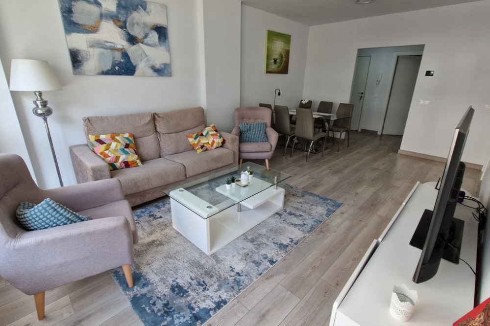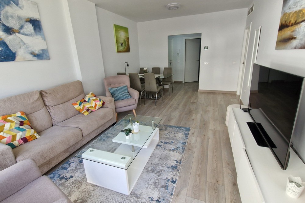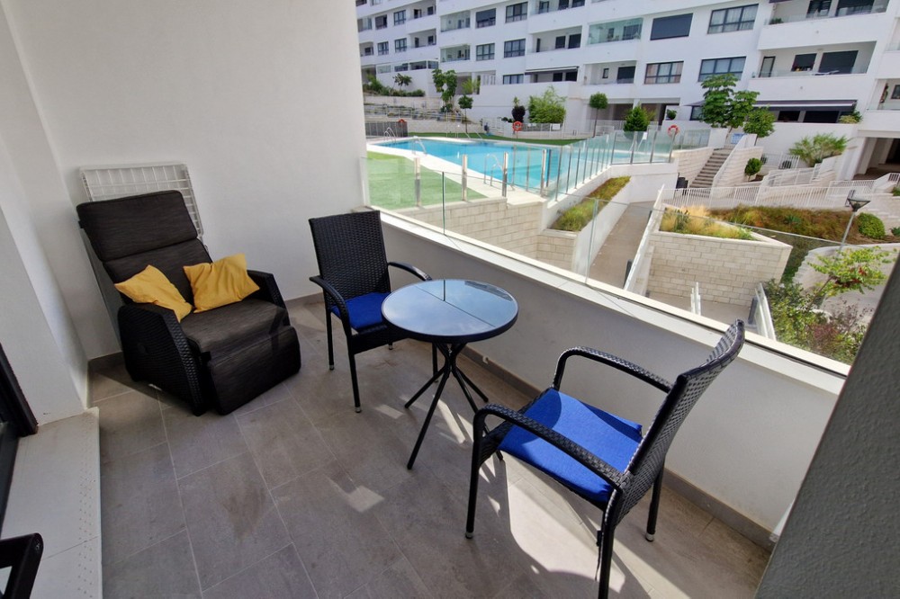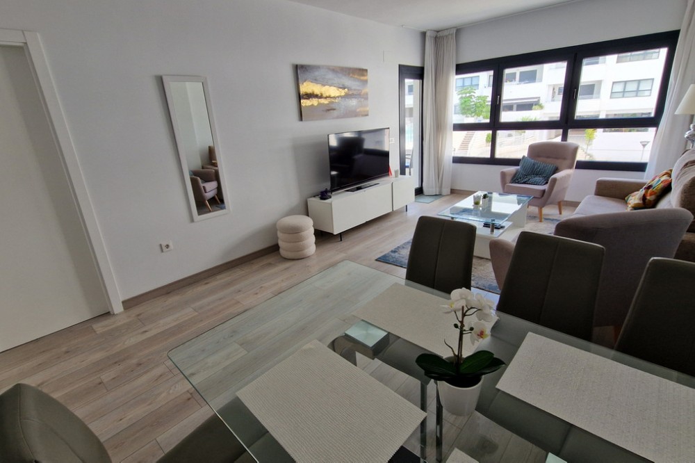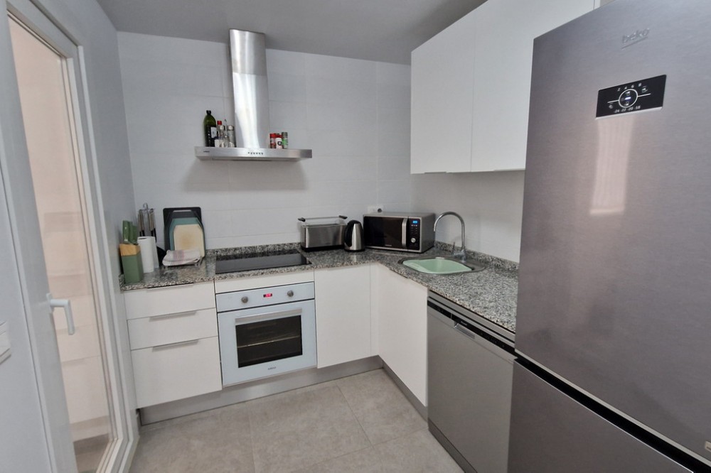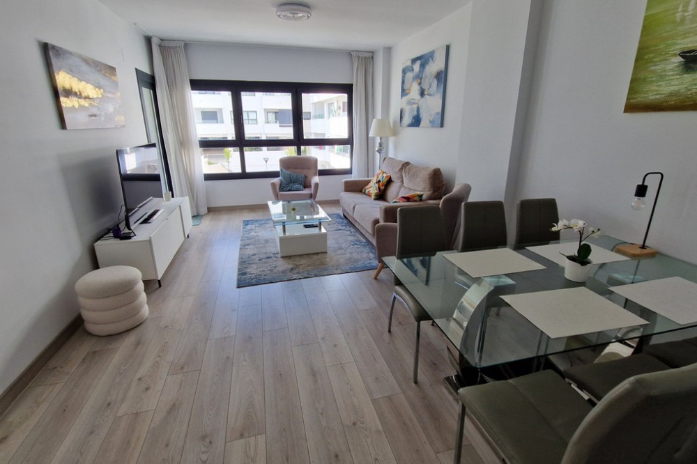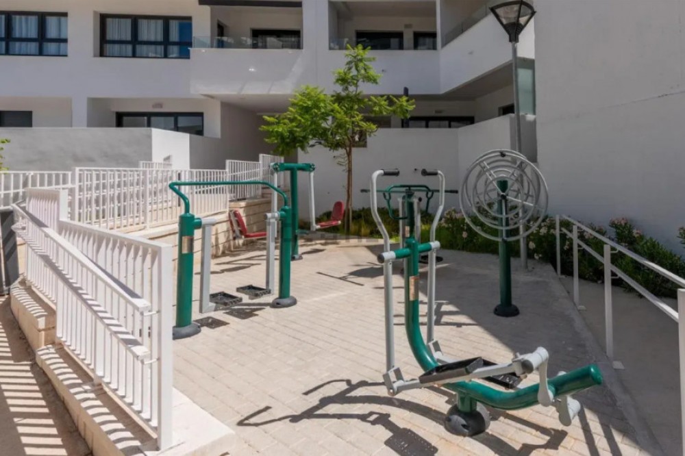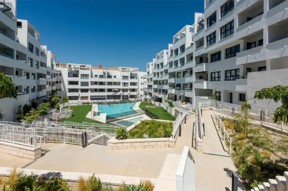 - Beautiful bright new 2 bedroom, 2 bathroom apartment in Estepona Gardens, which is a development located in the centre of Estepona town. This latest phase was built only 2 years ago in 2023. It is only 5 minutes walk from the historical Old Town and 10 minutes to the beach. Local amenities such as health centres, schools, parks, restaurants, shops and supermarkets are all within a short walk. This modern apartment has an entrance hall, 2 bedrooms, 2 bathrooms, (1 family bathroom with bath & shower, 1 ensuite with shower), separated by a small hall and door, leading to a large bright sitting-room, kitchen, utility room and terrace. It includes a garage space and a storage room. It is south west facing, located inside the complex, on the first floor overlooking the pool and children’s play area. Some of the features include the fitted kitchen and utility room, with all the appliances, air-conditioning hot/cold, solar panels on the roof for hot wáter and full WiFi coverage, amongst others. This first floor apartment is accessible with own key access through secure gates with internal intercom, via lift and stairs. The complex has extensive communal areas and gardens, including a large swimming pool, playground for children, and an outdoor gym.