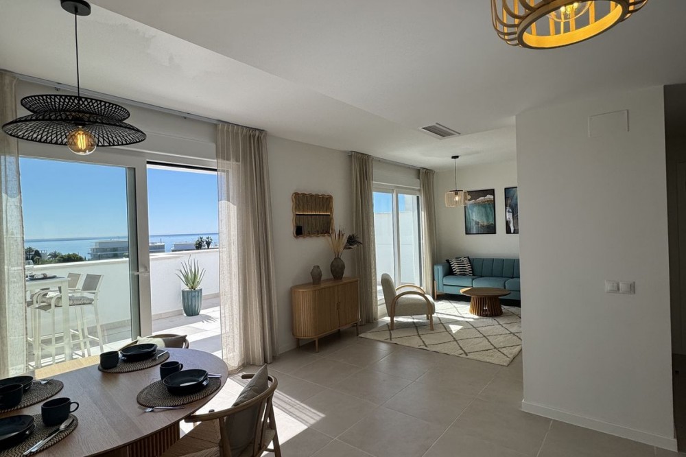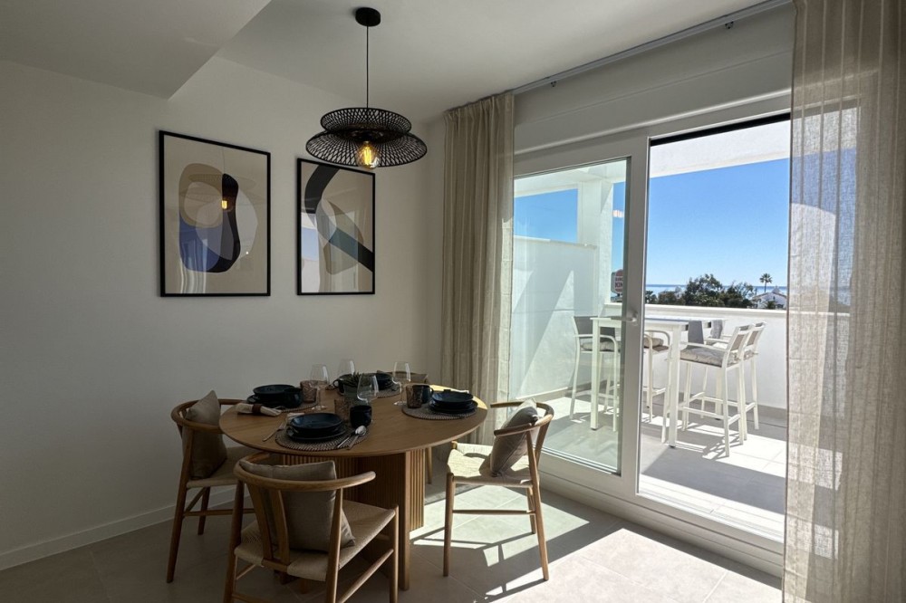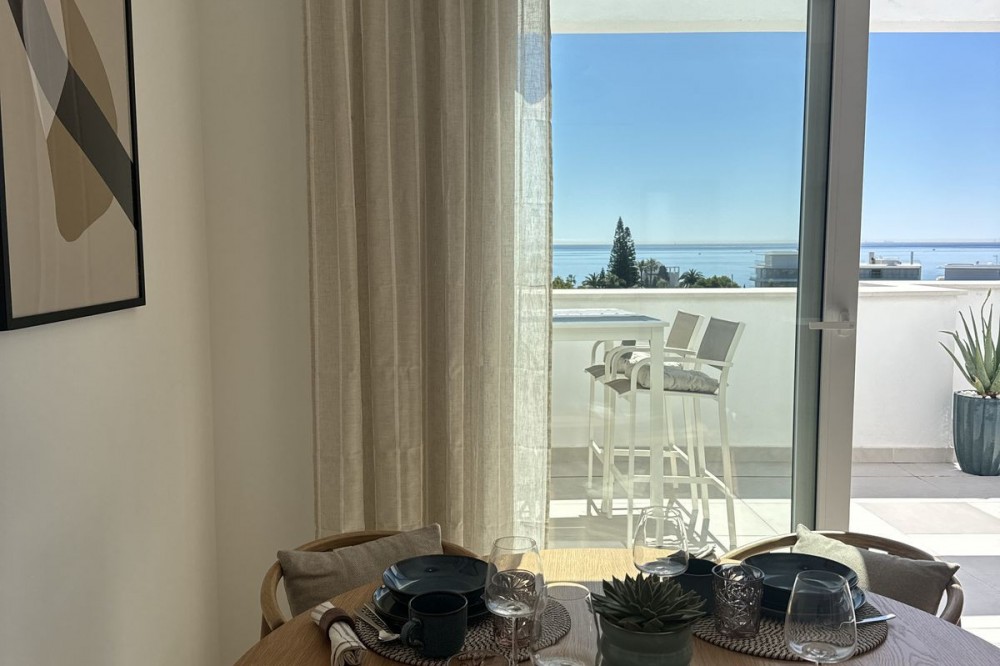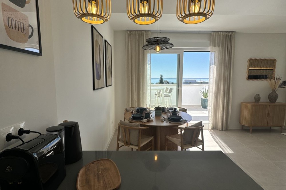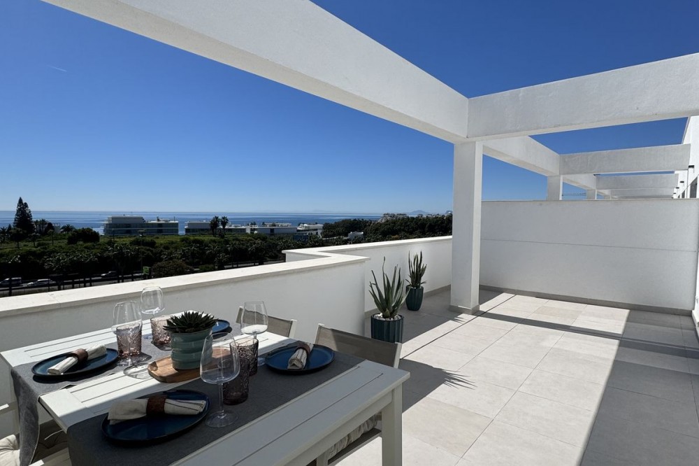 • This TOP FLOOR penthouse is located in a newly build development Celere Sea View in Estepona (Malaga), located in a newly developing built-up area, only 5 minutes from the town centre and the Estepona Marina. This location offers many leisure and service opportunities. Right next to the development you will find your daily supermarkets, as well as restaurants, school, sport center, the Estepona High Resolution Hospital all surrounded by several golf courses within a 5km radius, including Doña Julia Golf, Finca Cortesín Golf Club, Estepona Golf and Valle Romano Golf. This area is developing rapidly and has the potential to increase prices. This development is newly built, completed in November 2024. It consists of 3 intimate blocks of flats, ideally located; there are two supermarkets, a pharmacy and two restaurants right next to it and the beach is 300 meters away. The complex has a swimming pool, relaxation area and gym. The apartment is located on the top floor and has fantastic panoramic sea views from the terrace. The price includes a parking place in the underground garage and a storage room. This property meets all the conditions for short or long-term rental and is an ideal opportunity to invest funds.