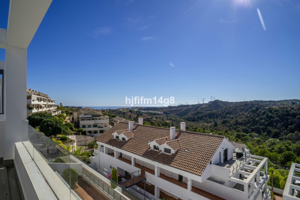 • This stunning 2-bedroom duplex penthouse for sale in Ocean Hills, Estepona offers modern, luxurious living with breathtaking panoramic views of the Mediterranean Sea, the surrounding mountains, and the protected natural park that borders the community. Situated in a unique, tranquil setting at the edge of this natural park, Ocean Hills ensures privacy and serenity while remaining just a five-minute drive from Estepona’s beaches. The gated community features two swimming pools, a gym, and beautifully landscaped communal areas, providing a peaceful yet convenient lifestyle on the Costa del Sol. As you enter the property, you are greeted by a bright open-plan layout with contemporary design features and a fully fitted modern kitchen equipped with Siemens or Bosch appliances, complemented by a separate utility room. The kitchen flows seamlessly into the spacious living and dining area, where large glass doors open onto an uncovered terrace—the perfect spot to enjoy the spectacular sea and mountain views. A guest toilet completes this level. Marble flooring throughout and hot and cold air conditioning enhance the sense of comfort and elegance, while lifts provide direct access from the garage to all floors. Upstairs, two spacious bedrooms each feature their own en-suite bathroom and direct access to a shared terrace, offering uninterrupted views of the Mediterranean Sea and surrounding mountains. This penthouse also includes two private parking spaces and one storage room, all included in the price. Ocean Hills is ideally located to enjoy some of the finest golf courses in the region, including those within Los Flamingos and near the prestigious 6-star Villa Padierna Hotel. Lifestyle amenities such as Puro Beach Club and Laguna Village are just a short drive away, offering plenty of options for dining, leisure, and entertainment while still enjoying a tranquil setting. Constructed by a respected developer with many years of experience in the Iberian property sector, this property comes with all payments independently guaranteed, providing peace of mind for both homeowners and investors. Combining comfort, modern design, and incredible panoramic views, this duplex penthouse in Ocean Hills is an exceptional home or investment opportunity on the Costa del Sol.