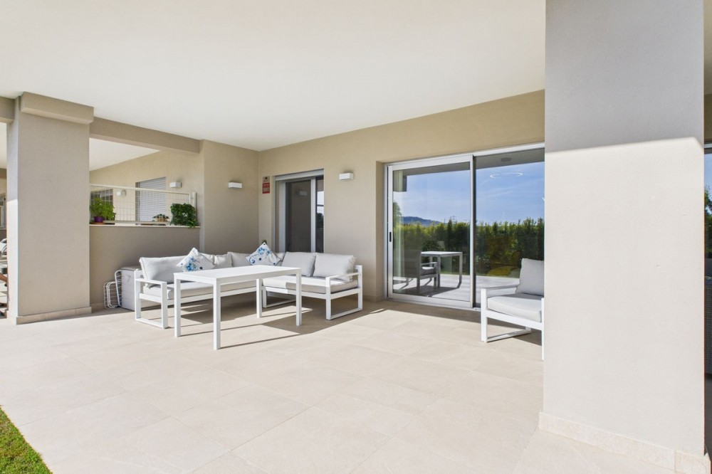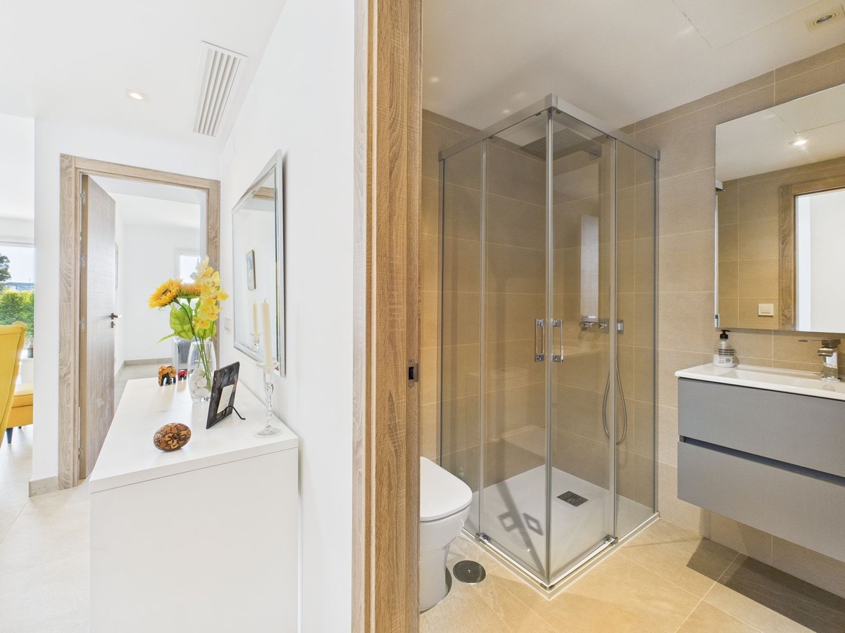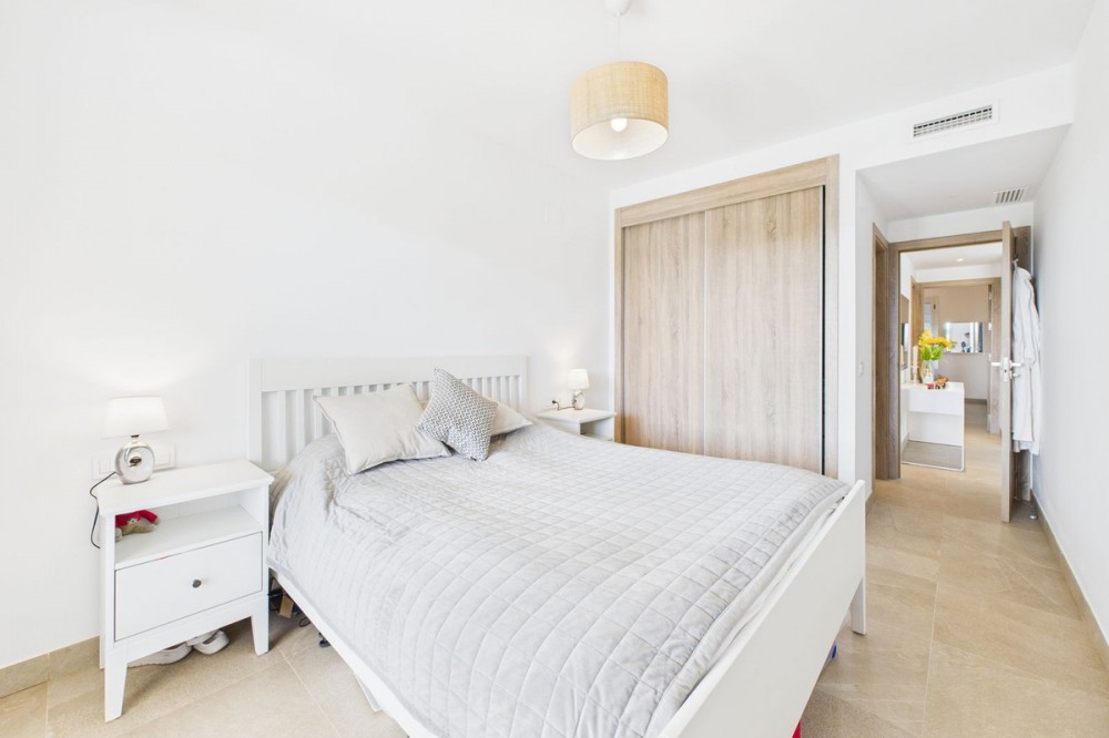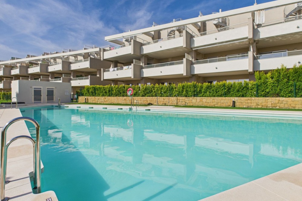 - Modern 2-Bedroom Ground Floor Apartment – Sunny Golf, Estepona Located within the newly completed Sunny Golf development in Estepona, this 2-bedroom, 2-bathroom ground floor apartment combines contemporary design with the relaxed Andalusian lifestyle. Set in a secure gated community surrounded by golf courses and natural beauty, the property offers a peaceful yet well-connected location just a short drive from beaches, shops, and the vibrant heart of Estepona town. Completed in 2024, the apartment enjoys a bright and spacious open-plan layout, featuring a generous living and dining area that flows seamlessly onto a private terrace with garden and mountain views. With its southwest orientation, the property benefits from sunshine throughout the afternoon and spectacular sunsets over the surrounding hills. Key features include: 2 spacious bedrooms and 2 modern bathrooms Open-plan kitchen and living area with abundant natural light Private terrace ideal for outdoor dining and relaxation Communal swimming pool set within beautifully landscaped gardens overlooking the golf course Secure gated community with modern infrastructure and contemporary design Designated parking space included Perfect as a holiday home, permanent residence, or investment property, this stylish apartment offers all the comforts of modern living within a quiet and well-maintained community. With its desirable orientation, peaceful views, and brand-new construction, this property represents an excellent opportunity to enjoy modern Mediterranean living in one of Estepona’s most up-and-coming residential areas. Book a viewing now, keys are in office.