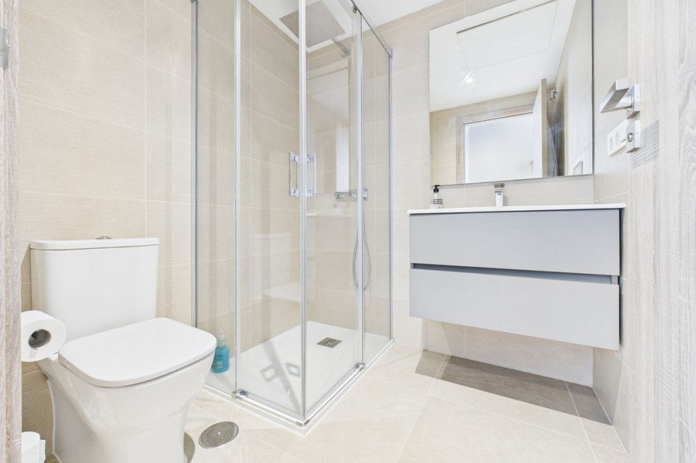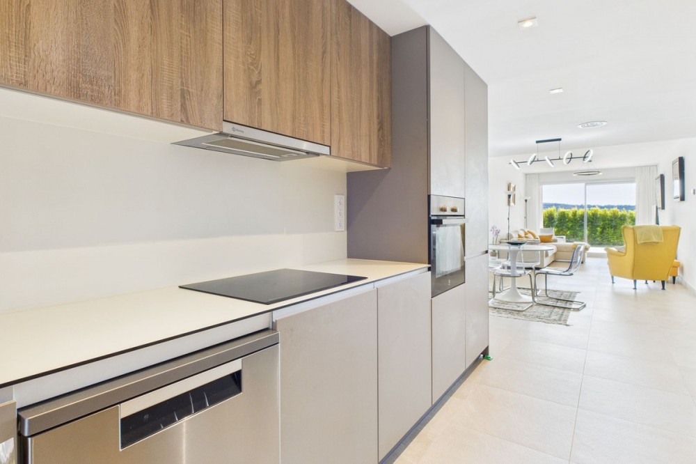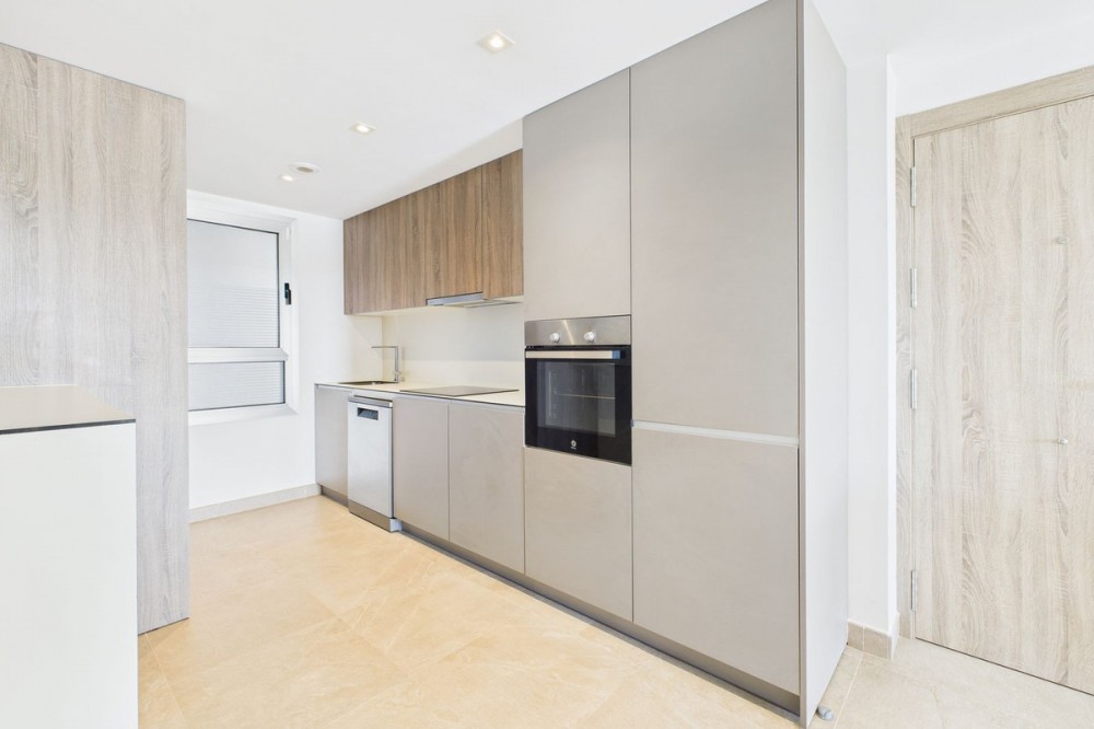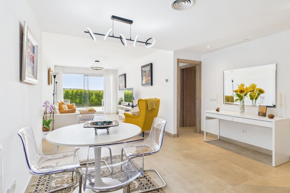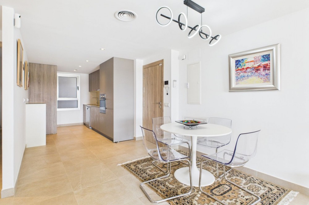 - Modern 2-Bedroom Ground Floor Apartment – Sunny Golf, Estepona Located within the newly completed Sunny Golf development in Estepona, this 2-bedroom, 2-bathroom ground floor apartment combines contemporary design with the relaxed Andalusian lifestyle. Set in a secure gated community surrounded by golf courses and natural beauty, the property offers a peaceful yet well-connected location just a short drive from beaches, shops, and the vibrant heart of Estepona town. Completed in 2024, the apartment enjoys a bright and spacious open-plan layout, featuring a generous living and dining area that flows seamlessly onto a private terrace with garden and mountain views. With its southwest orientation, the property benefits from sunshine throughout the afternoon and spectacular sunsets over the surrounding hills. Key features include: 2 spacious bedrooms and 2 modern bathrooms Open-plan kitchen and living area with abundant natural light Private terrace ideal for outdoor dining and relaxation Communal swimming pool set within beautifully landscaped gardens overlooking the golf course Secure gated community with modern infrastructure and contemporary design Designated parking space included Perfect as a holiday home, permanent residence, or investment property, this stylish apartment offers all the comforts of modern living within a quiet and well-maintained community. With its desirable orientation, peaceful views, and brand-new construction, this property represents an excellent opportunity to enjoy modern Mediterranean living in one of Estepona’s most up-and-coming residential areas. Book a viewing now, keys are in office.