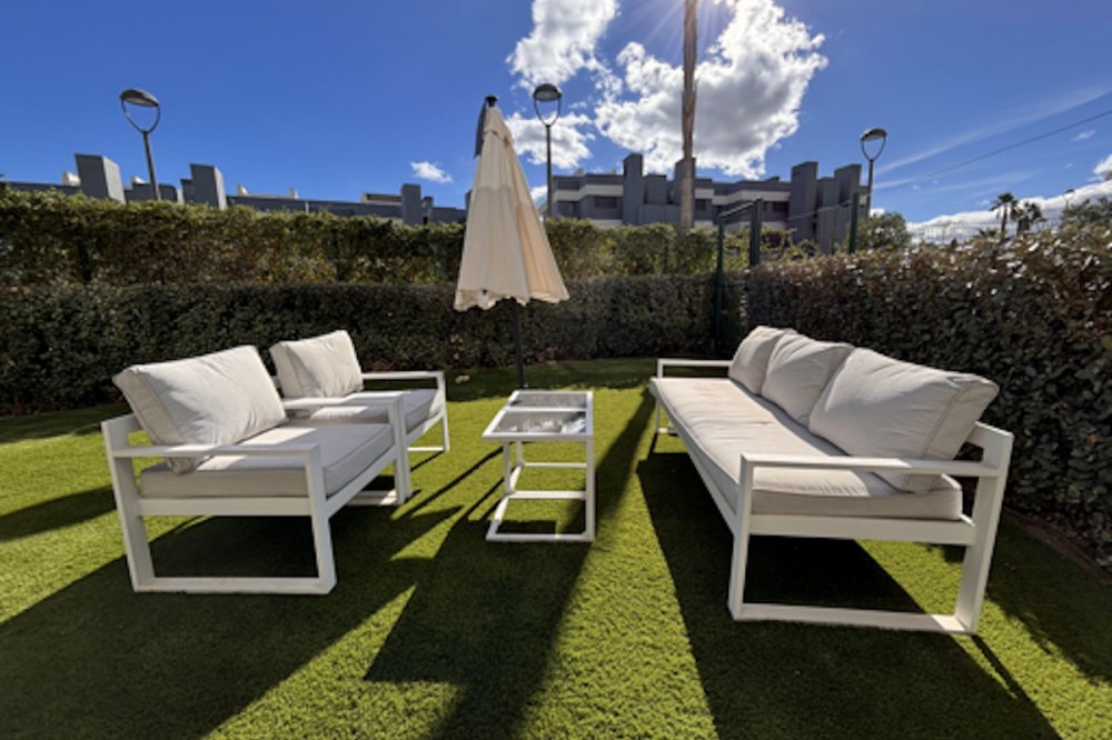 - Modern Mediterranean corner ground-floor apartment located between Estepona and Puerto Banús, offering a unique opportunity to enjoy an exclusive lifestyle in the sought-after area of La Resina. Featuring three bedrooms and two bathrooms, this property stands out for its contemporary design and seamless connection between indoor and outdoor spaces. Its south-facing orientation ensures natural light throughout the day, while the spacious private garden with pool views creates an ideal setting for relaxation or social gatherings in total privacy The open-concept living room, dining area and kitchen flow effortlessly onto the terrace and garden, creating a bright, spacious and welcoming environment. The kitchen is equipped , extended cabinetry and a separate laundry area. The master bedroom includes a charming enclosed terrace that provides an additional sunlit and serene space. All bedrooms feature built-in wardrobes and electric shutters, while the overall finishes reflect a high standard of quality, comfort and style The residential complex offers a range of exclusive amenities designed to enhance the comfort and well-being of its residents, including a heated indoor pool, fully equipped gym, spa with sauna and steam room, and an elegant clubhouse for private events and social gatherings. The landscaped gardens surround a large outdoor swimming pool. In 2025, an exclusive paddle club with eleven courts, wellness area and restaurant will open, further increasing the appeal of this premium community The location is exceptional, with easy access to both Estepona and Puerto Banús and surrounded by top-tier services including the Atlas American School of Málaga with over 700 students, the recently expanded private hospital Hospiten, supermarkets such as Mercadona, Aldi, Lidl and Carrefour, and a diverse culinary offering including trendy beach clubs like Bossa and Sonora. The property includes one underground parking space and a storage room, with the option to purchase a second parking space if desired. The apartment is in excellent condition, ready to move into.