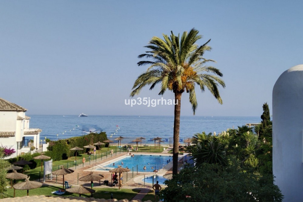 • Cozy apartment of 100 m², located on the beachfront in a gated and private community with green areas, a communal swimming pool, tennis court, children's and adult pools with direct access to the beach, and ample parking within the closed and private residential complex. This fantastic apartment is distributed into a spacious living-dining room, fully furnished and equipped open-plan kitchen, two bedrooms, 1 bathroom, with a large private terrace and its own private pool. Fully renovated with high-quality materials and design. South-facing, the apartment is very bright and offers panoramic sea views. Do not miss this investment opportunity or permanent residence.
