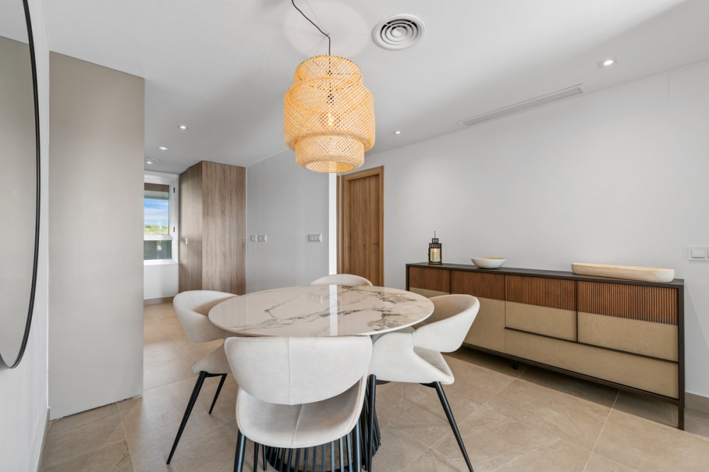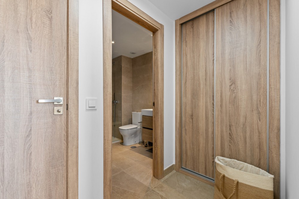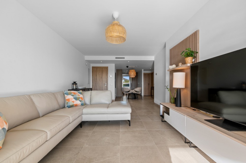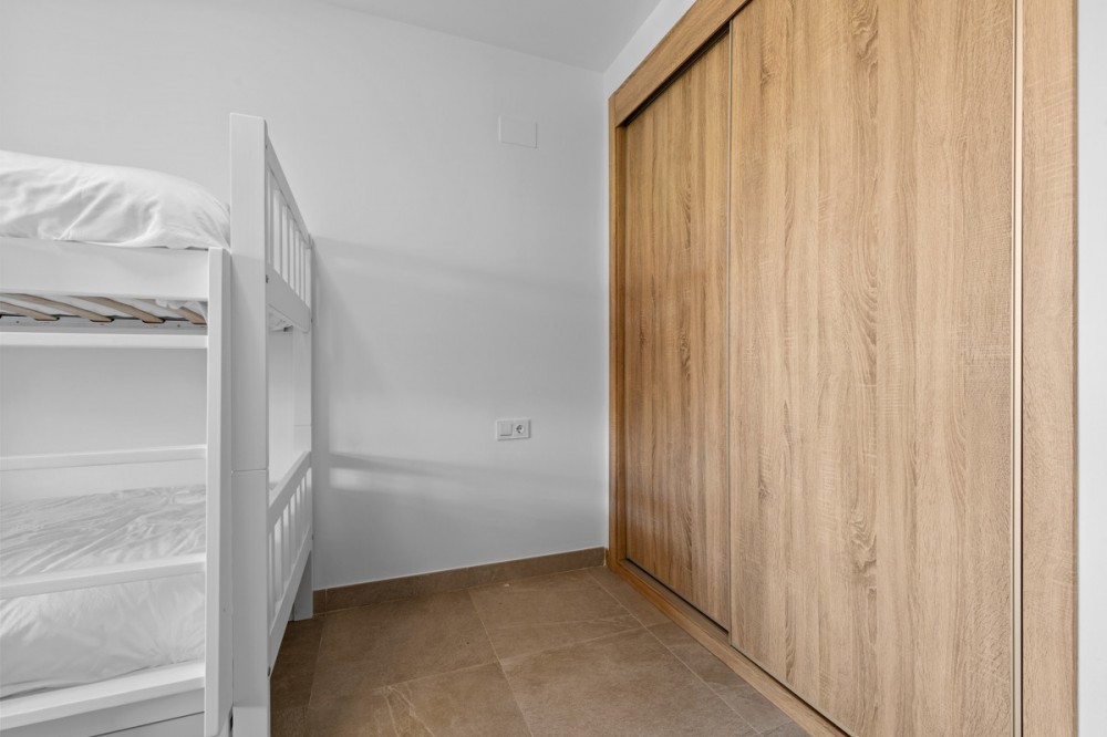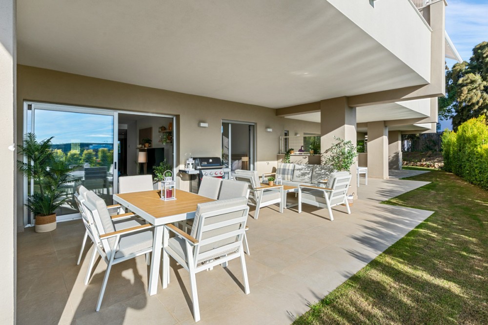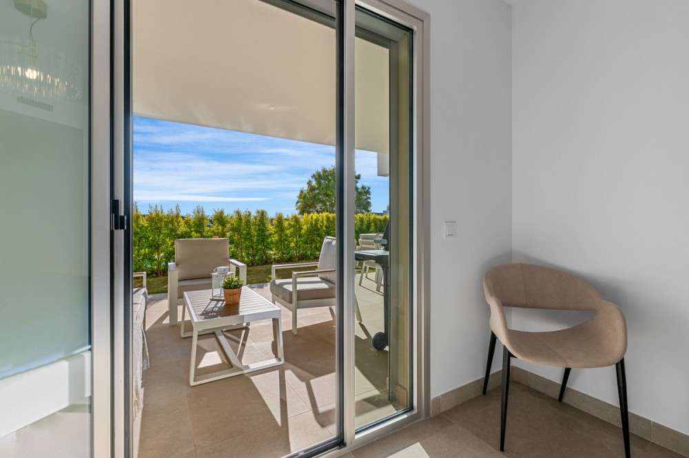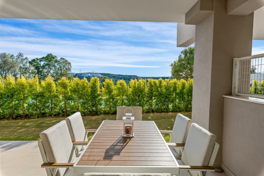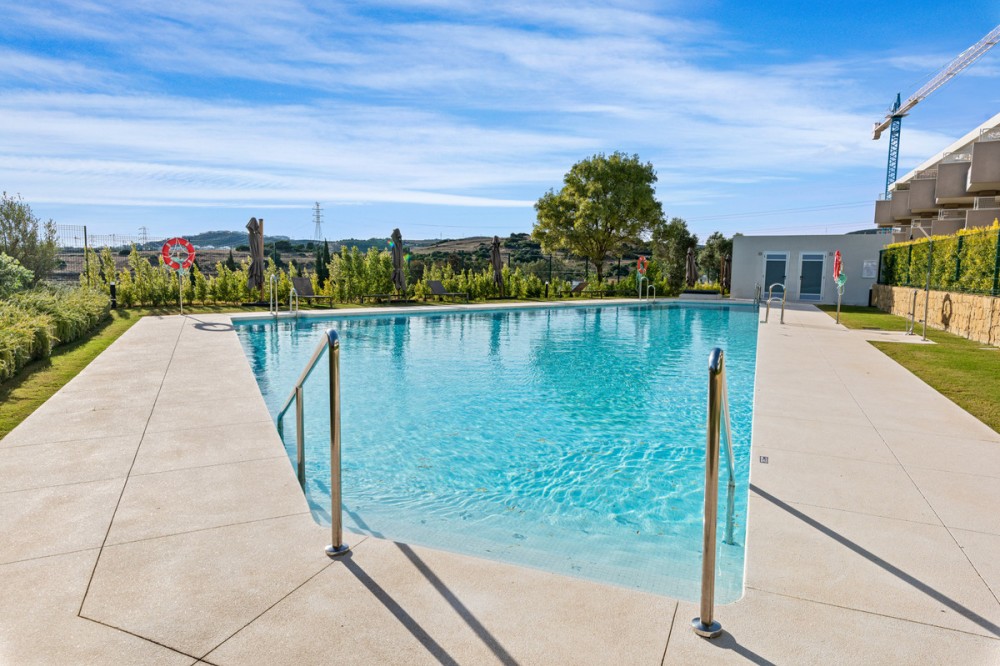 - Ground-floor apartment in a recently completed complex in the heart of Estepona Golf The development is recently completed and offers a modern design, communal gardens and a shared swimming pool. The location provides quick access to Estepona town, local services and the wider Costa del Sol. The property overlooks the communal pool and enjoys west-facing views across the golf course. The layout includes an open-plan main living area with air conditioning and a fully fitted kitchen equipped with dishwasher, oven, hob, washing machine and dryer. The space opens directly onto a covered terrace and a small private garden. There are two bedrooms and two bathrooms. The principal bedroom includes an en-suite shower room and has direct access to the terrace. The second bedroom is served by a separate bathroom. Both bedrooms have air conditioning. The apartment is sold with an outside parking space. It is a practical option within a well-maintained development close to the golf course and surrounding amenities.