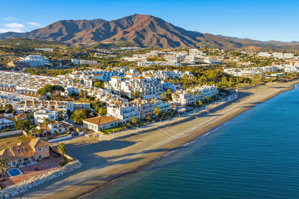 - Located in a prestigious front-line beach complex just west of Estepona, this three-bedroom ground-floor apartment offers an exceptional blend of coastal comfort and relaxed Mediterranean living. With direct access to the garden and just steps from the sand and the iconic Paseo Marítimo, it provides a rare opportunity to enjoy the beachfront lifestyle in one of the area’s most sought-after settings. The apartment benefits from an unbeatable location: daily amenities are close by, Estepona’s vibrant town centre is only a short drive away, and the peaceful seaside surroundings create an ideal balance of convenience and tranquillity. Inside, the bright and spacious layout connects the kitchen, dining, and living areas in an open-plan flow that encourages effortless living and entertaining. Large windows and sliding doors invite natural light and provide a seamless transition to the outdoor areas. A standout feature of this home is its generous private garden and terrace—perfect for enjoying quiet mornings, al fresco dining, or simply relaxing by the sea. The outdoor space extends the living area and enhances everyday enjoyment of the coastal environment. The master suite offers a serene retreat with sea views and its own stylish en-suite bathroom. Two additional guest bedrooms share a well-appointed bathroom, ensuring comfort and privacy for family and visitors. With 115 square metres of interior space and a 15-square-metre terrace leading directly to the garden, the property combines practicality with elegant living. A private garage space and a spacious storage room add further convenience. The complex features classic Andalusian architecture, a large communal pool surrounded by lush greenery, and direct access to the beach and seaside promenade, ideal for leisurely walks, cycling, or simply enjoying the Mediterranean climate. This inviting ground-floor apartment captures the essence of beachfront living, where comfort, space, and a privileged location come together by the shores of the Mediterranean.
