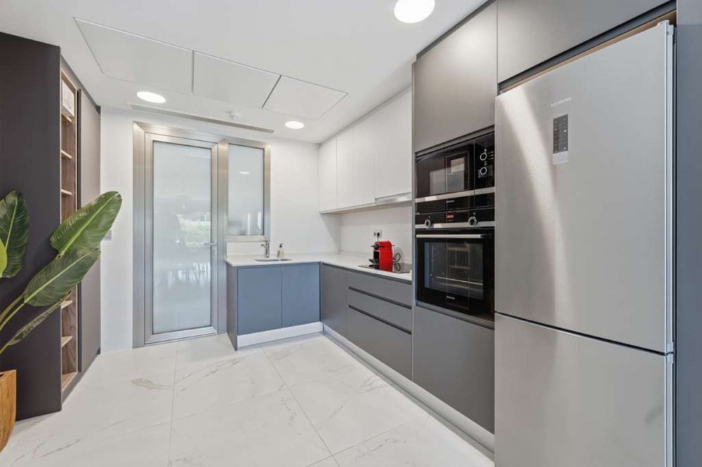 - Welcome to this elegant and spacious apartment located in the highly sought-after area of Las Mesas, Estepona, just a short walk from the city centre, port, beaches, and all amenities. This modern home combines contemporary design with comfort and practicality, making it perfect as a permanent residence, holiday home, or investment opportunity. Short-term rentals are approved by the community. Built in 2020, the Las Mesas urbanisation offers excellent communal facilities, including a large swimming pool, spacious gym, and beautifully maintained gardens. Las Mesas offers excellent connectivity to Estepona’s historic old town and marina, both within walking distance. Nearby are a dog park, sports facilities such as paddle courts and a fitness centre, and shops, all in a peaceful and private setting. Marbella is only 20 minutes away by car, and Málaga Airport can be reached in under an hour via either the A-7 coastal highway or AP-7 highway. The property is situated on an elevated ground floor, providing additional safety and privacy. Upon entering, you are welcomed by a bright and spacious living room filled with natural light and furnished with high-end furniture. The open-plan kitchen is fully equipped with Siemens appliances, while the laundry and utility room also features a Siemens washing machine and dryer. The master bedroom, complete with an en-suite bathroom, is spacious and features built-in wardrobes. The second bedroom is also generously sized, ensuring each part of the home feels open, warm, and inviting. All windows are fitted with electric blinds. The south-facing terrace offers plenty of sunshine and comfort, perfect for relaxing or dining outdoors. Both parking spaces and storage rooms are conveniently accessible by stairs or lift directly from the street floor level. The property was designed for energy efficiency and built to high construction standards, with features such as insulation and soundproofing, hot and cold air conditioning, and underfloor heating in the bathrooms. Each room can be individually climate-controlled for maximum comfort. Included in the sale are two underground parking spaces, two storage rooms, and all furniture, allowing you to move in straight away and start enjoying your new home.