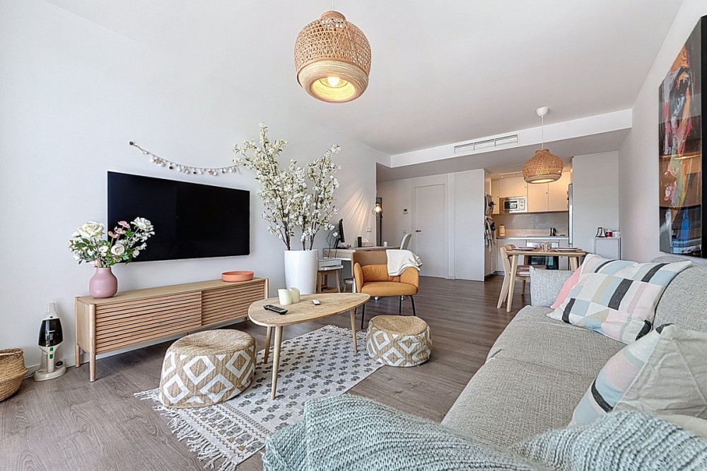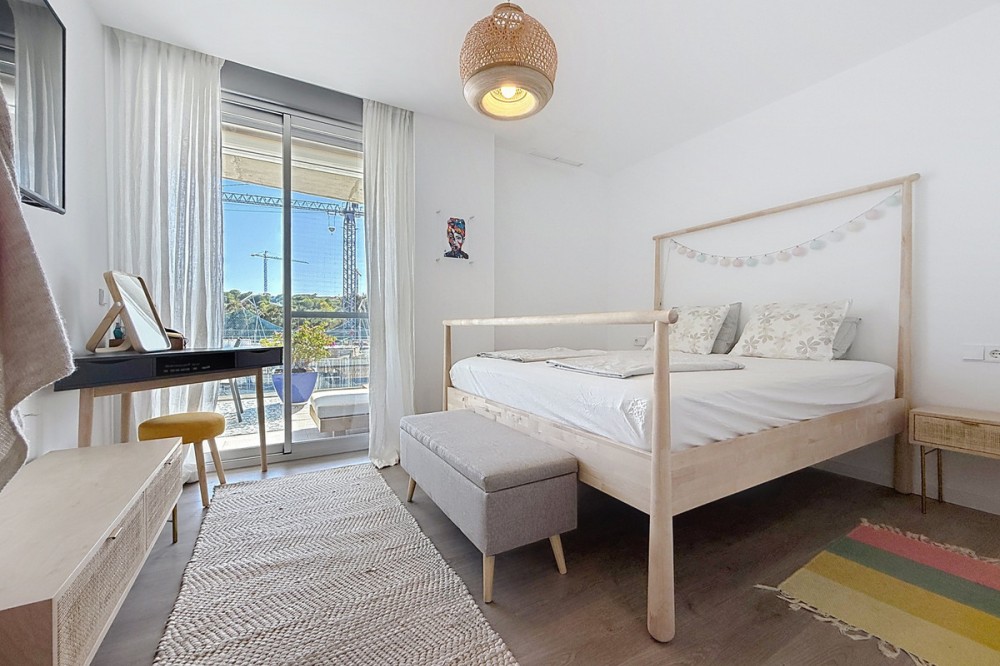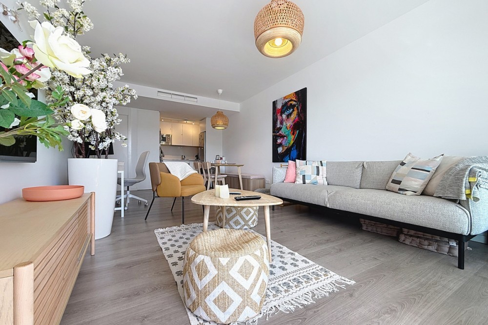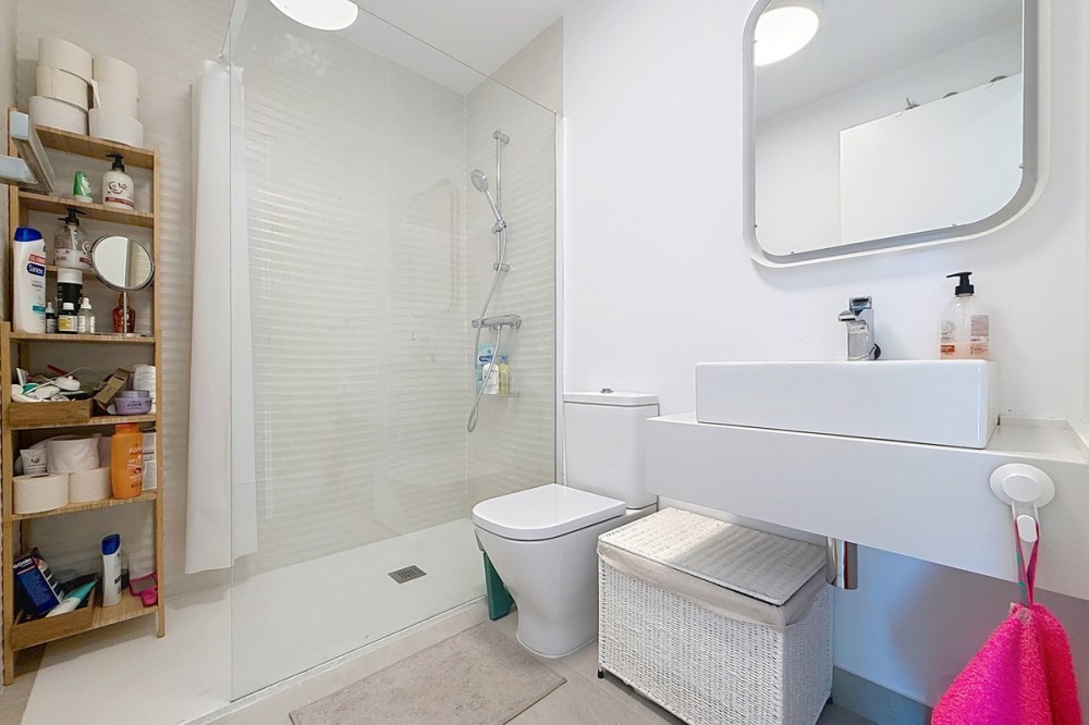 • This beautiful three-bedroom, two-bathroom apartment benefits from a southwest orientation, ensuring lovely afternoon light and pleasant sunsets. From the terrace, you can enjoy open views of the surrounding nature, with a partial sea view to the left. The terrace also features a private jacuzzi, perfect for unwinding at the end of the day. The interior has been designed in a modern Mediterranean style with high-quality materials. The open-plan kitchen, fully equipped (refrigerator, oven, ceramic hob, etc.), opens onto a welcoming living area that extends seamlessly to the outside. An underground parking space and a storage room are included. The residence offers perfectly maintained gardens and a large swimming pool. It also enjoys an ideal location: the beach is within walking distance (around 15 minutes), and the ports of Estepona and La Duquesa are just a few minutes away by car.