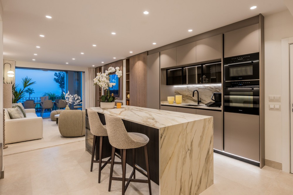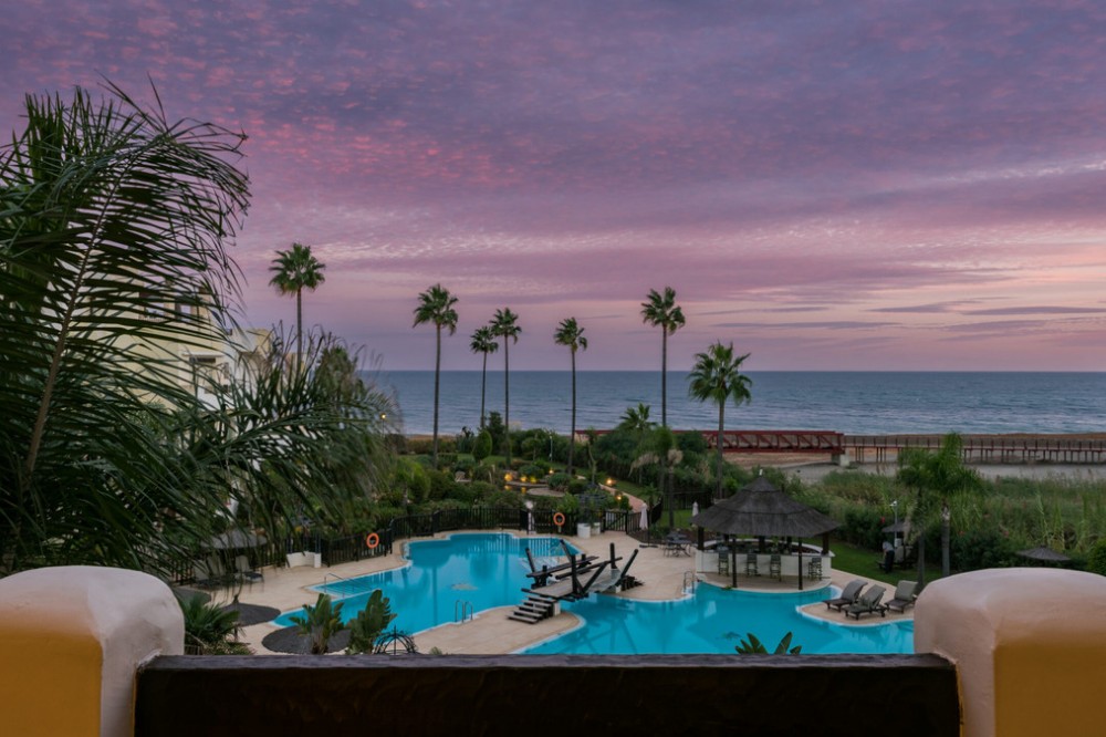 - Location & Community Positioned between Marbella and Estepona, Bahía del Velerín is a prestigious beachfront gated community renowned for its lush tropical gardens, expansive lagoon-style swimming pool with snack bar, 24 / 7 security, and direct access to one of the region’s finest beaches. Property Highlights 3 bedrooms | 2 bathrooms 120 m² built interior | 38 m² terrace Fully renovated to the highest standards, with sea and garden views. South-west facing, taking full advantage of light and location. Terrace with glass curtain system and under-floor heating, effectively extending the living space for all-year use. Interior & Finishes Every detail has been considered: Designer open-plan kitchen with premium German appliances Invisible induction hob, wine fridge, Thermomix station Electric fireplace and Bang & Olufsen high-end sound system High-quality flooring, custom built-in wardrobes, hidden laundry room area Storage room and underground parking included for convenience. Lifestyle & Investment Potential Situated in one of the most sought-after beachfront communities of the Costa del Sol, the property offers the perfect blend of a luxurious permanent home, an exclusive holiday residence or a high-end rental investment. Residents benefit from immediate beach access, resort-style communal facilities and a serene yet connected coastal lifestyle. Summary Bahía del Velerín 3.5 is a turnkey luxury apartment in a prime beachfront setting, refurbished to exceptional standards and ready for immediate occupation or rental. With 3 bedrooms, 2 bathrooms, 120 m² of elegant interior space and a 38 m² terrace overlooking lush gardens and the Mediterranean Sea, this home represents an outstanding opportunity.