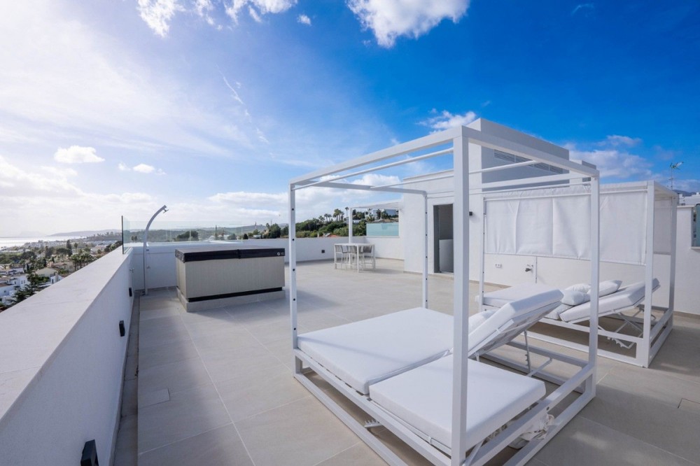 - Luxury corner, West-Facing 3-Bedroom corner Penthouse with Solarium & Jacuzzi – Estepona. Exceptional corner,west-facing luxury penthouse located within a secure gated community in Estepona, offered fully furnished with brand-new luxury furniture and ready for immediate occupation — no expense spared, move straight in. The property enjoys 180° sea views from the lounge and spectacular 380° panoramic views from the private solarium, which features a jacuzzi and ample space for outdoor living and entertaining. Situated just 500 metres from the beach, the penthouse combines privacy, comfort, and an exceptional coastal lifestyle. The apartment offers 114.65 m² of interior living space, complemented by a 67.30 m² terrace and an impressive 108.15 m² solarium. Finished to the highest standard, it includes underfloor heating throughout and €40,000 worth of upgraded packages included directly from the developer. Residents benefit from resort-style communal facilities, including a fully equipped luxury gym, sauna, and outdoor swimming pools with open sea views, all set within beautifully landscaped communal areas. Ideally located, Estepona’s vibrant city centre is just 2 km away and easily accessible on foot, while excellent road connections place Marbella only 20 minutes away, Sotogrande 20 minutes, and Málaga International Airport approximately 40 minutes away. Property features: 3 bedrooms West-facing 180° sea views from lounge 380° panoramic views from solarium Private solarium with jacuzzi Brand-new luxury furniture included Underfloor heating throughout Gated community 500 m to the beach Additional features: 2 underground garage spaces (12.50 m² each) 1 storage room (7.90 m²) A rare opportunity to acquire a turnkey luxury penthouse in one of Estepona’s most desirable residential areas.