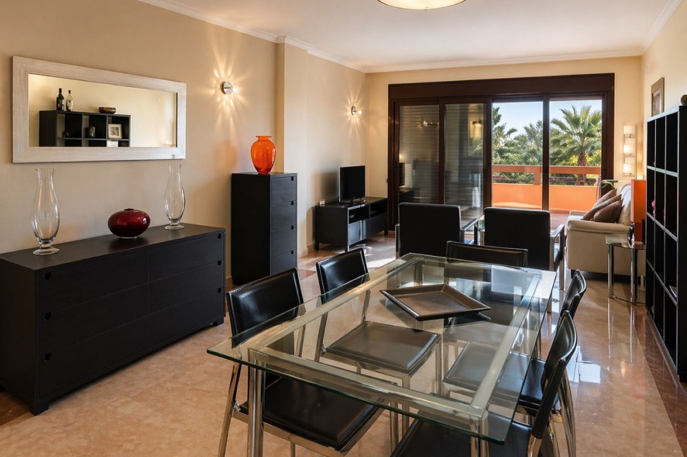 - Elegant Apartment in Nueva Galera – Sea Views, Sunlight & Serenity Set within the peaceful and well-kept development, just 7 km from the vibrant centre of Estepona, this beautiful and comfortable apartment offers the perfect balance between tranquillity and coastal living. Positioned on a sunny hillside only 300 metres from the beach, it enjoys a privileged setting with open views towards the Mediterranean. The property welcomes you with a sense of space and light, offering approximately 100 m² of well-distributed interior living. The bright and inviting living-dining area is tastefully furnished in a modern, comfortable style and opens seamlessly onto a generous 30 m² terrace. Partially covered with a pergola and equipped with awnings, this outdoor space is ideal for relaxing or entertaining while enjoying views over the gardens and the sea. The apartment features two spacious bedrooms and two bathrooms, including an elegant en-suite with double sinks, bidet and a hydromassage bathtub, creating a private retreat within the home. The fully fitted kitchen is equipped with high-quality appliances and designed for both practicality and style, while built-in wardrobes with interior fittings add to the sense of organisation and comfort. With its southeast orientation, the property benefits from abundant natural light throughout the day. Air conditioning with heating ensures year-round comfort, making it suitable both as a permanent residence and as a holiday home. The development itself offers beautifully maintained gardens, a swimming pool and a children’s play area, all within a secure and quiet environment. A lift, private garage space and storage room add further convenience. Everything you need is within easy reach: supermarkets just 600 metres away, restaurants and public transport nearby, and the sandy Playa de la Galera only a short walk from your door. Golf courses, equestrian centres and attractions such as Selwo Aventura and Gibraltar are all easily accessible. A property that truly needs to be experienced in person to appreciate its atmosphere, location and potential.