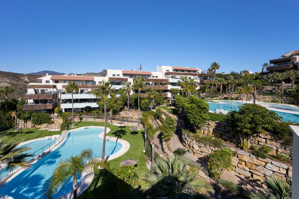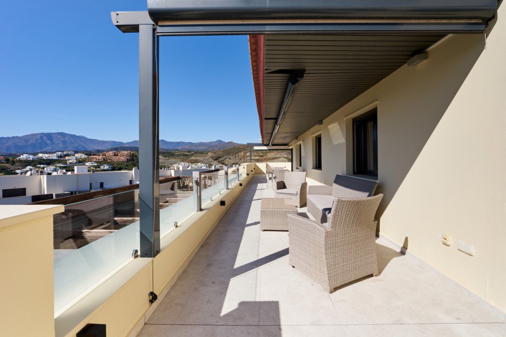 - Situated in the prestigious area Los Flamingos, Estepona East, Malaga. It has a spacious built area of 150 m² and an extensive terrace of 200 m². The penthouse has two spacious bedrooms and two bathrooms, providing privacy and comfort. The third bedroom has been converted into a dressing room. The fully fitted open plan kitchen has modern appliances that seamlessly connect with the living areas. The property is in excellent condition, reflecting the meticulous maintenance and attention to detail. The highlight of this penthouse is the outdoor living with its private terrace offering panoramic views of the sea, mountains, golf courses. Residents can also enjoy three communal swimming pools and a beautiful garden, as well as access to a tennis/paddle court, mini golf. The property is part of a gated community with a secure entrance, video intercom and lift, providing peace of mind and convenience. Additional features include electric blinds, double glazing, storage and fibre internet. Located close to golf courses, schools, restaurants and a 10 minute drive to the city centre, this penthouse combines tranquility and affordability. A private garage provides secure parking and pets are welcome, making it an ideal choice for families. Furniture is not included in the price. Don't hesitate to call us and visit this wonderful penthouse!