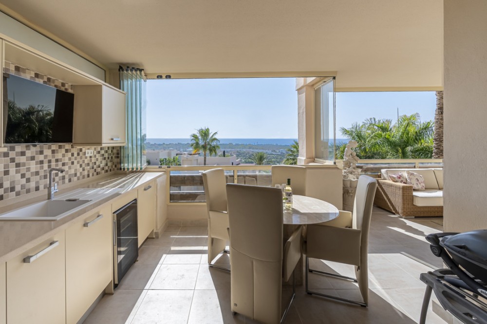 - Located in the sought-after Paraiso Barronal area, this stylish 2-bedroom, 2-bathroom apartment offers modern comfort in a serene setting. Spanning 134 m², it features a 24 m² enclosed terrace with a summer kitchen, wine cooler, and additional refrigerator, perfect for year-round relaxation and entertaining. Fully furnished and equipped with high-end Siemens appliances, a Bosch washing machine and dryer, and ducted air conditioning, this home ensures both elegance and convenience. One of the bathrooms has been recently renovated, adding a contemporary touch. Set within a gated community with a swimming pool and landscaped gardens, the apartment also includes two underground parking spaces and a 6 m² storage room. With breathtaking sea and La Concha mountain views, it is ideally located near shops, restaurants, and top golf courses. A fantastic opportunity for those seeking a refined home in Estepona. Contact us today for more details.