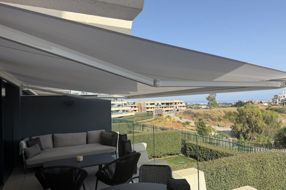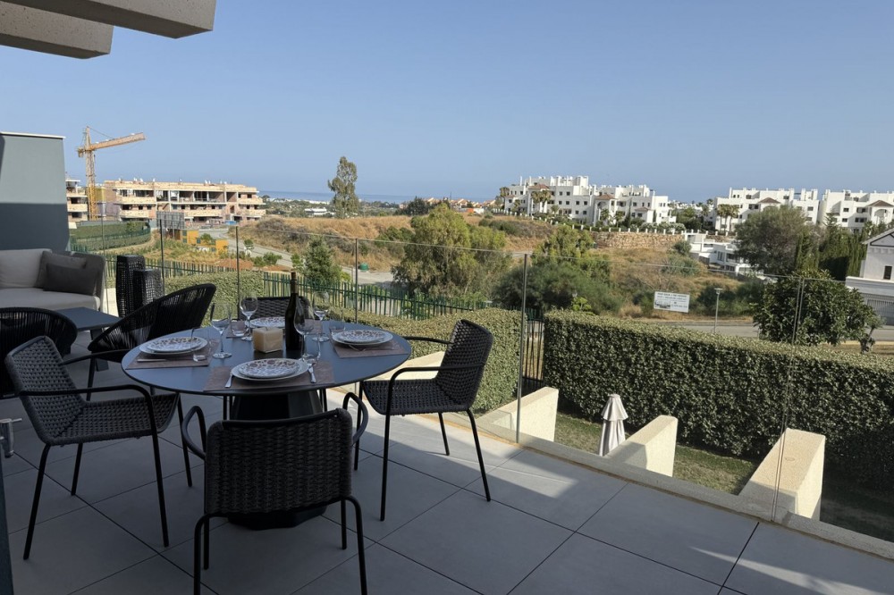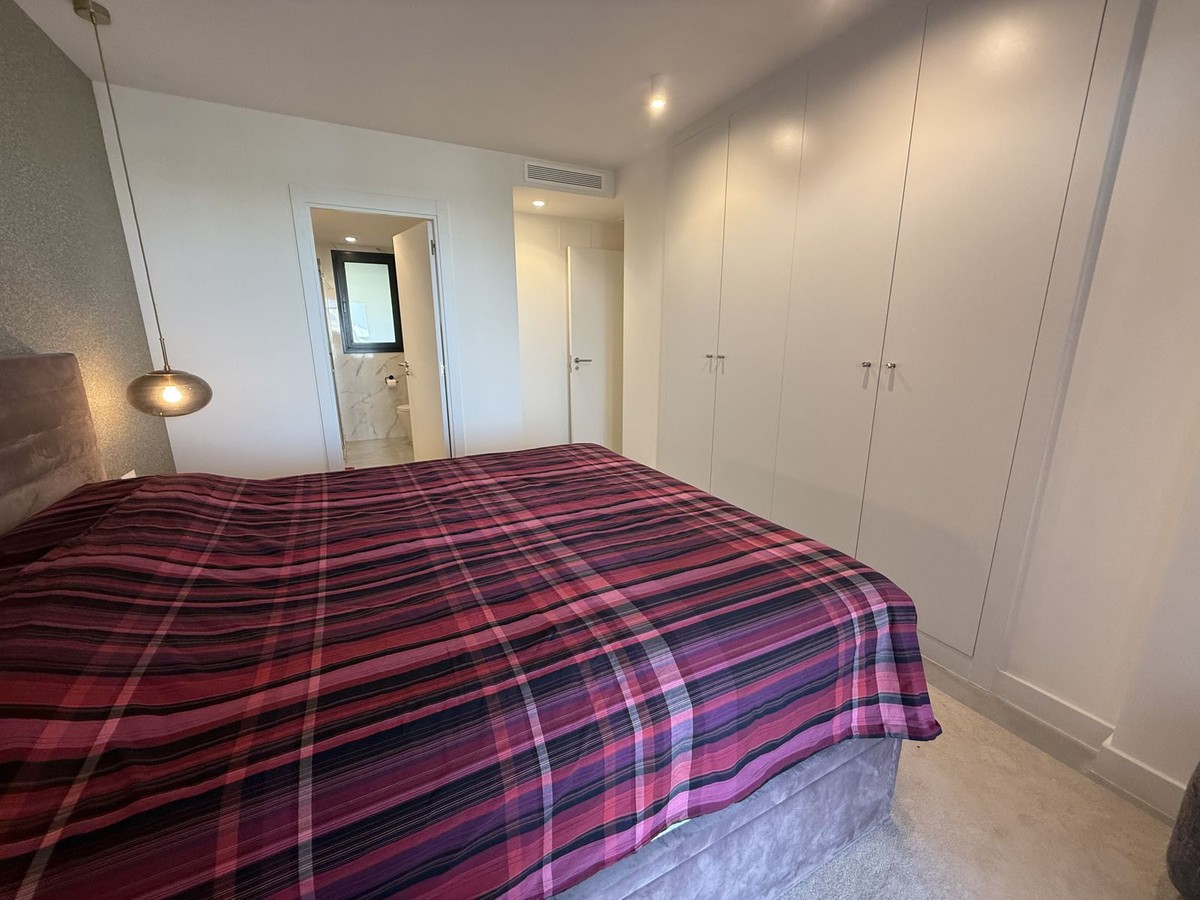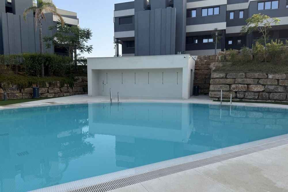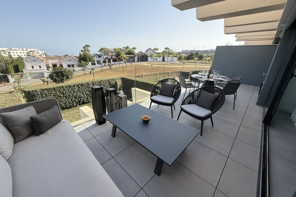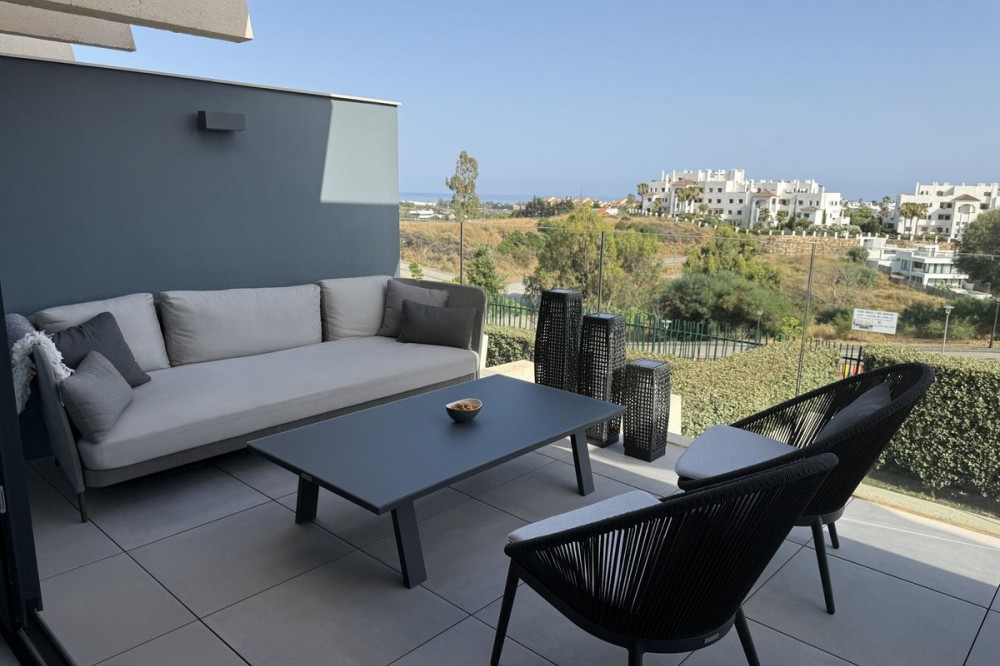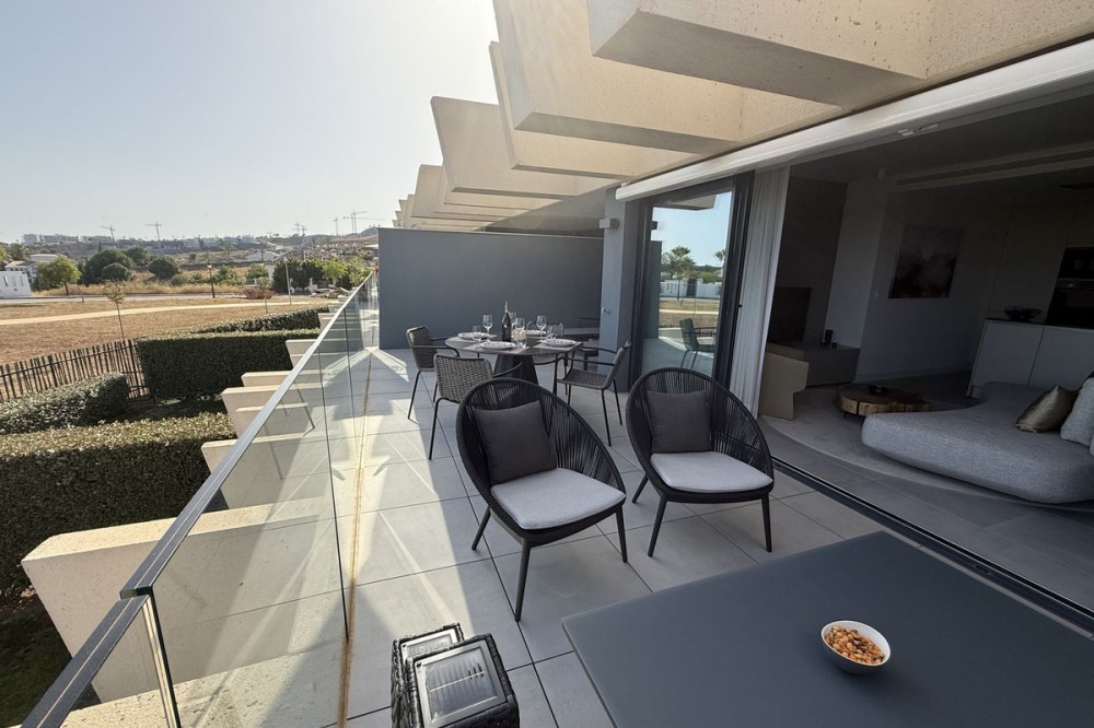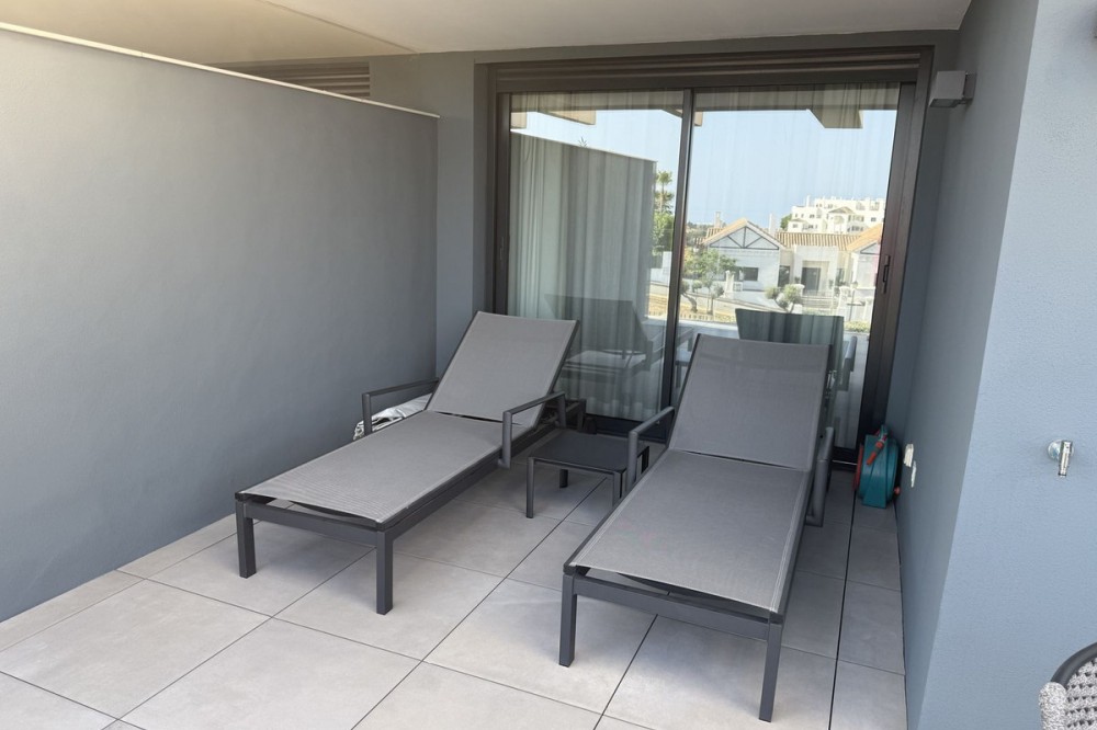 - Elegant 2-Bedroom Apartment with Sea Views in Oasis 325 – Turn-Key with (optional) Designer Furnishings On the gentle hills that follow the Guadalmansa River on its way to the sea lies Oasis 325 – a privileged residential enclave ideally located between Estepona and Marbella. Its elevated position offers breathtaking views over the Mediterranean and surrounding natural areas, creating a serene, private atmosphere just minutes from the best of the Costa del Sol. This beautifully appointed 2-bedroom apartment is situated on one of the best spots within the development, offering uninterrupted sea views, lush green surroundings, and exceptional peace. Delivered in 2021–2022 and maintained in impeccable condition, the property is presented fully furnished with refined designer pieces and is ready to move into – a true turn-key residence. The interior living space of 102 m² flows naturally into a spacious 28 m² terrace that faces southwest, ensuring sun from late morning until sunset. The layout includes an open-plan living and dining area with large sliding doors that open directly onto the terrace. The fully equipped kitchen is centered around a sleek island with integrated induction hob, combining elegance and functionality in a space designed for both cooking and socialising. The master bedroom offers direct access to the terrace and enjoys spectacular views of the sea – a rare and privileged feature. The second bedroom is also generously sized, and both bathrooms are equipped with walk-in showers and finished in a modern, minimalist style. Throughout the apartment, high-quality materials, tasteful decoration, and abundant natural light create an atmosphere of calm and understated luxury. The terrace itself is ideal for year-round enjoyment, featuring a cosy side corner that captures the lower winter sun and a smart, automatically retractable sun awning that adjusts based on wind strength. Thanks to a large protected green zone in front of the building, the views will remain unobstructed indefinitely, offering permanent visual space, silence, and privacy. As a resident of Oasis 325, you’ll enjoy access to a wide range of first-class facilities designed to promote wellness and relaxation. These include an outdoor infinity pool with separate children’s section, both surrounded by soft-touch synthetic grass, and a heated indoor pool with a beautiful cascade fountain. The wellness area features a sauna and Turkish bath, and the fully equipped gym includes separate male and female changing rooms, each with showers and private lockers. A modern co-working lounge completes the offering, ideal for remote professionals or digital nomads. The apartment comes with one underground parking space and a spacious private storage room in the basement, with more than enough space for electric bikes and additional storage needs. Additional features include energy-efficient hot and cold air conditioning, solar-assisted aerothermal water heating, double-glazed windows, and high thermal insulation, contributing to the property’s excellent A/B energy rating. This property represents a rare opportunity to enjoy modern Mediterranean living at its finest – combining panoramic sea views, timeless design, and full peace of mind in one of the most desirable developments on the Costa del Sol. Design furniture is not included in this price but possible at additional cost (30K)