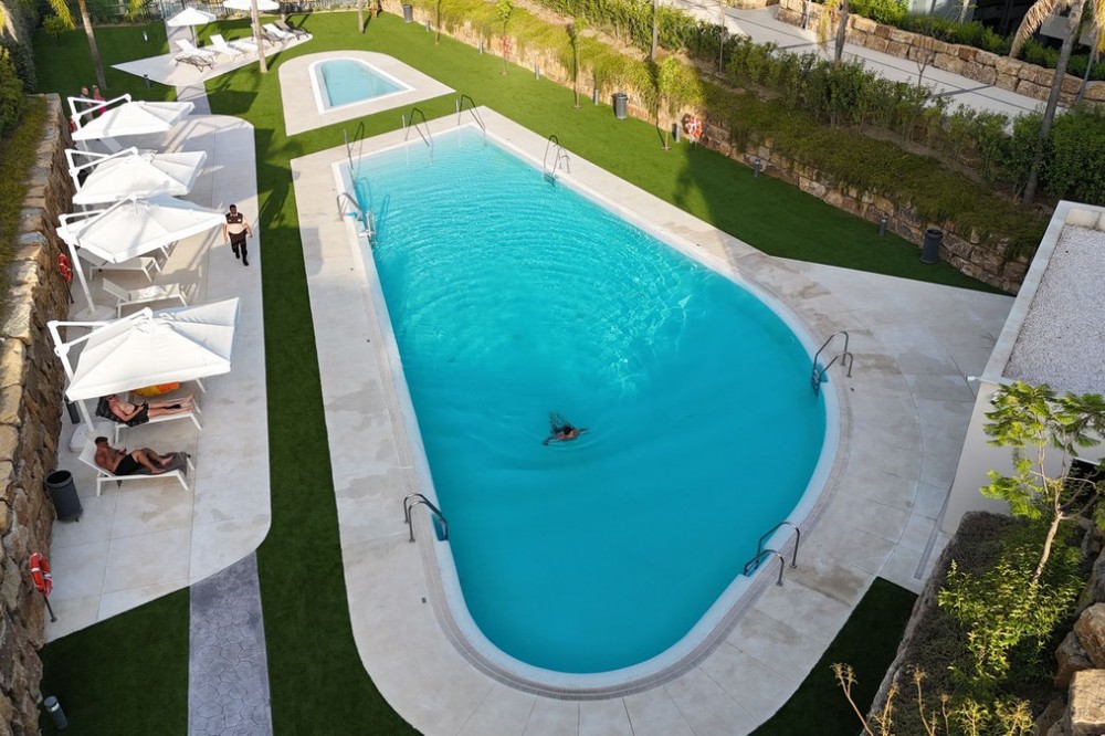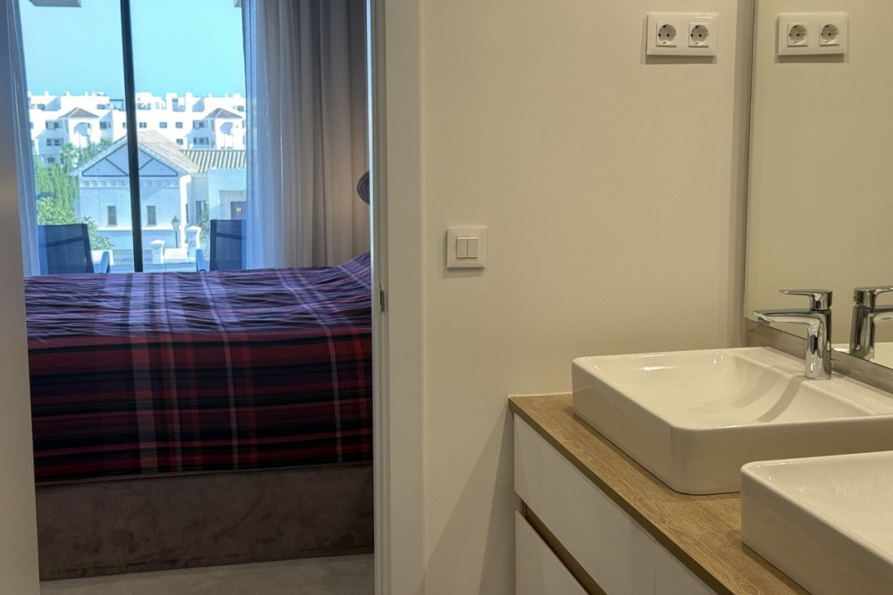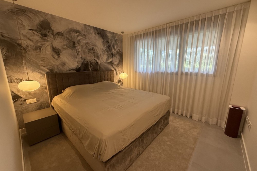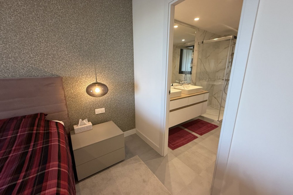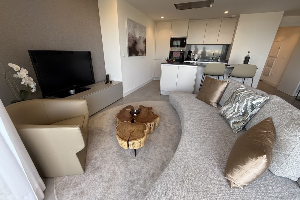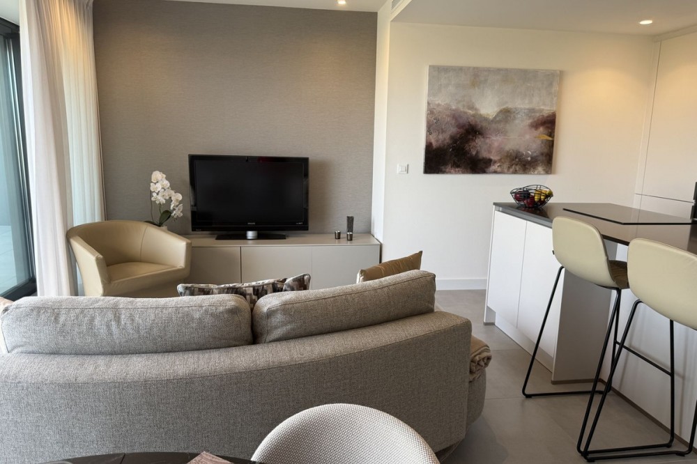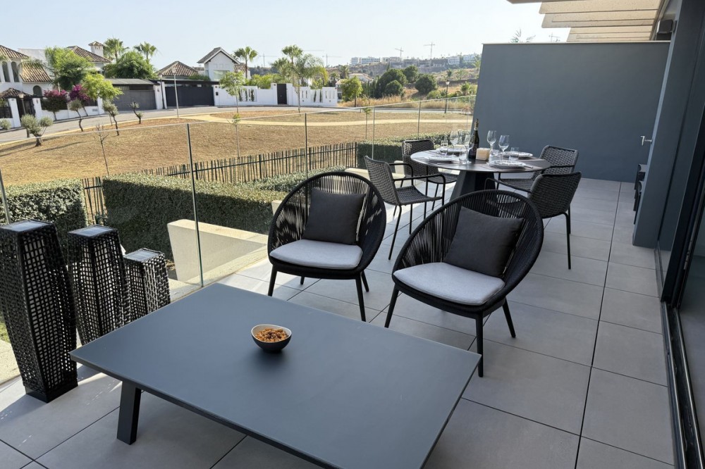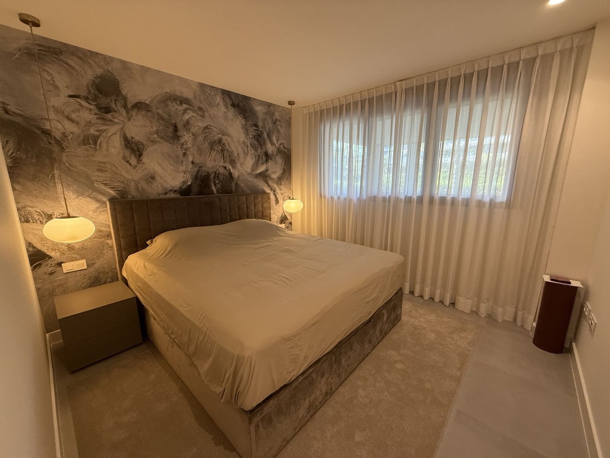 - Elegant 2-Bedroom Apartment with Sea Views in Oasis 325 – Turn-Key with (optional) Designer Furnishings On the gentle hills that follow the Guadalmansa River on its way to the sea lies Oasis 325 – a privileged residential enclave ideally located between Estepona and Marbella. Its elevated position offers breathtaking views over the Mediterranean and surrounding natural areas, creating a serene, private atmosphere just minutes from the best of the Costa del Sol. This beautifully appointed 2-bedroom apartment is situated on one of the best spots within the development, offering uninterrupted sea views, lush green surroundings, and exceptional peace. Delivered in 2021–2022 and maintained in impeccable condition, the property is presented fully furnished with refined designer pieces and is ready to move into – a true turn-key residence. The interior living space of 102 m² flows naturally into a spacious 28 m² terrace that faces southwest, ensuring sun from late morning until sunset. The layout includes an open-plan living and dining area with large sliding doors that open directly onto the terrace. The fully equipped kitchen is centered around a sleek island with integrated induction hob, combining elegance and functionality in a space designed for both cooking and socialising. The master bedroom offers direct access to the terrace and enjoys spectacular views of the sea – a rare and privileged feature. The second bedroom is also generously sized, and both bathrooms are equipped with walk-in showers and finished in a modern, minimalist style. Throughout the apartment, high-quality materials, tasteful decoration, and abundant natural light create an atmosphere of calm and understated luxury. The terrace itself is ideal for year-round enjoyment, featuring a cosy side corner that captures the lower winter sun and a smart, automatically retractable sun awning that adjusts based on wind strength. Thanks to a large protected green zone in front of the building, the views will remain unobstructed indefinitely, offering permanent visual space, silence, and privacy. As a resident of Oasis 325, you’ll enjoy access to a wide range of first-class facilities designed to promote wellness and relaxation. These include an outdoor infinity pool with separate children’s section, both surrounded by soft-touch synthetic grass, and a heated indoor pool with a beautiful cascade fountain. The wellness area features a sauna and Turkish bath, and the fully equipped gym includes separate male and female changing rooms, each with showers and private lockers. A modern co-working lounge completes the offering, ideal for remote professionals or digital nomads. The apartment comes with one underground parking space and a spacious private storage room in the basement, with more than enough space for electric bikes and additional storage needs. Additional features include energy-efficient hot and cold air conditioning, solar-assisted aerothermal water heating, double-glazed windows, and high thermal insulation, contributing to the property’s excellent A/B energy rating. This property represents a rare opportunity to enjoy modern Mediterranean living at its finest – combining panoramic sea views, timeless design, and full peace of mind in one of the most desirable developments on the Costa del Sol. Design furniture is not included in this price but possible at additional cost (30K)