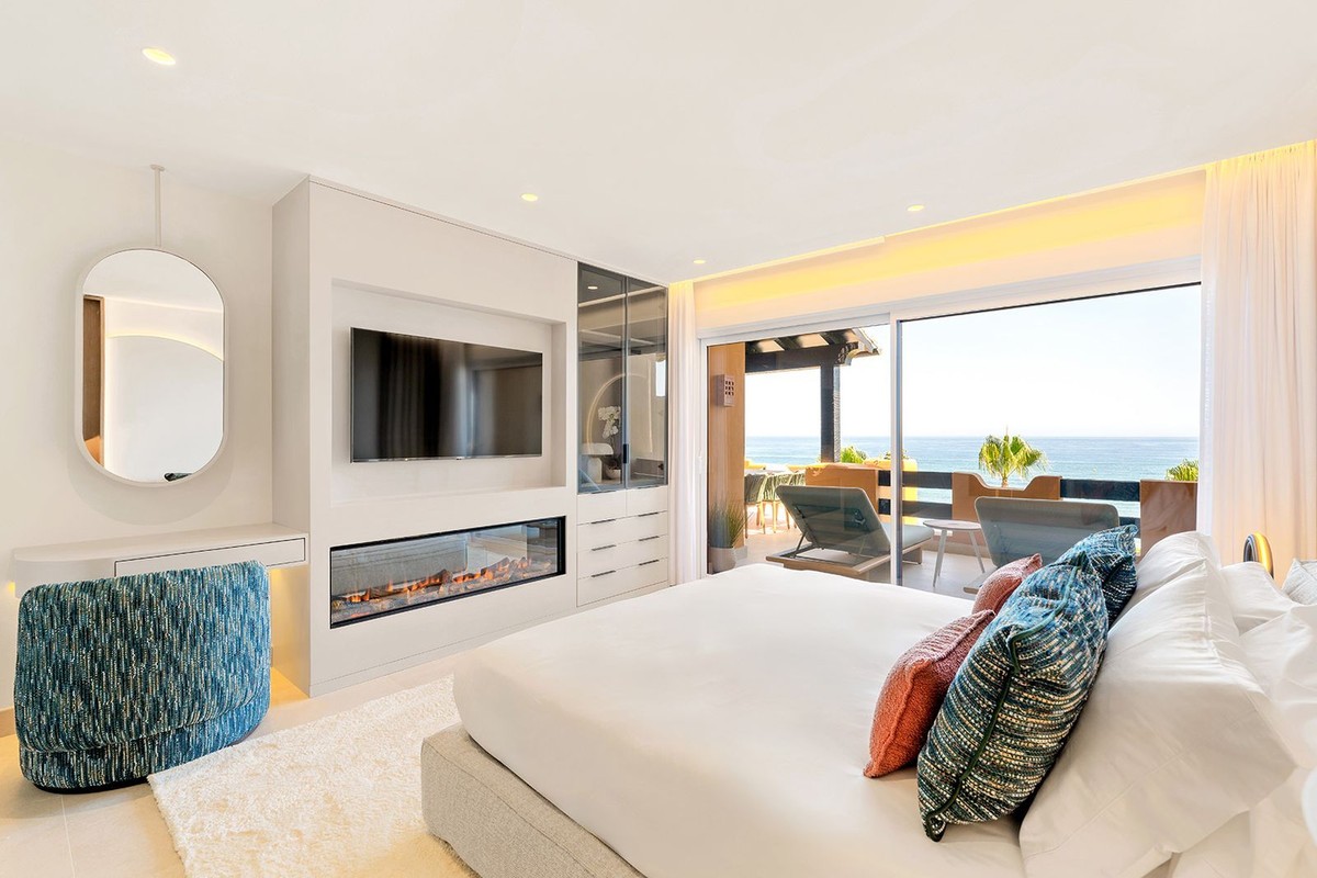 - This fully remodelled 4 bedroom and 4 bathroom apartment is an amazing opportunity for people who are looking for luxury and comfort in a stunning beachfront location. The spacious living and dining room and the luxurious master bedroom with its en-suite bathroom and walk-in wardrobe both have direct access to the impressive south facing terrace with panoramic sea views. Los Granados del Mar is one of the most exclusive urbanizations on the New Golden Mile with breathtaking views of the Mediterranean Sea. Its combination of beautifully maintained gardens and luxurious facilities such as an on-site restaurant, a heated indoor pool, 2 outdoor pools, a gym, a sauna, a Jacuzzi and 24h security make this community one of a kind. It has direct beach access and is very close to all amenities, shops, schools, high class restaurants, the newly build Laguna complex and the center of Estepona. This bright 187 m² apartment boasts a brand-new open-concept designer kitchen with premium German appliances and luxurious extras, including a Bang & Olufsen sound system, an electric fireplace, and a freestanding bathtub. Underground parking with direct lift access to the apartment as well as a secure storage room are included in the price.