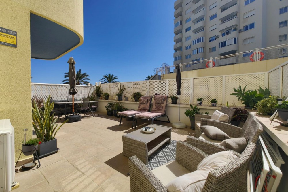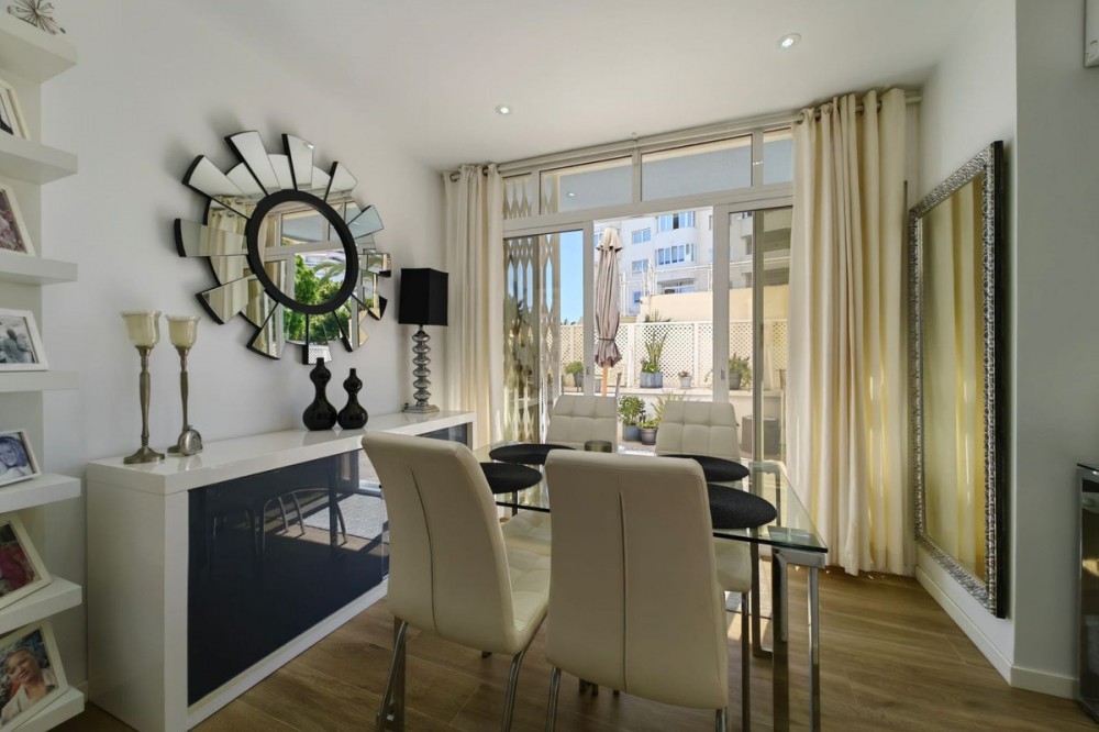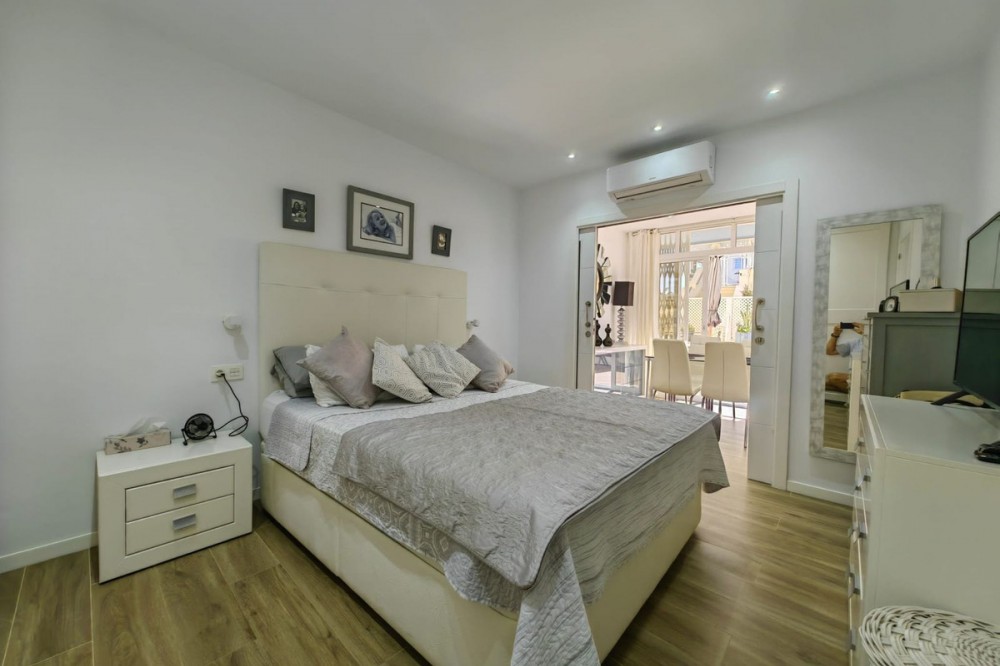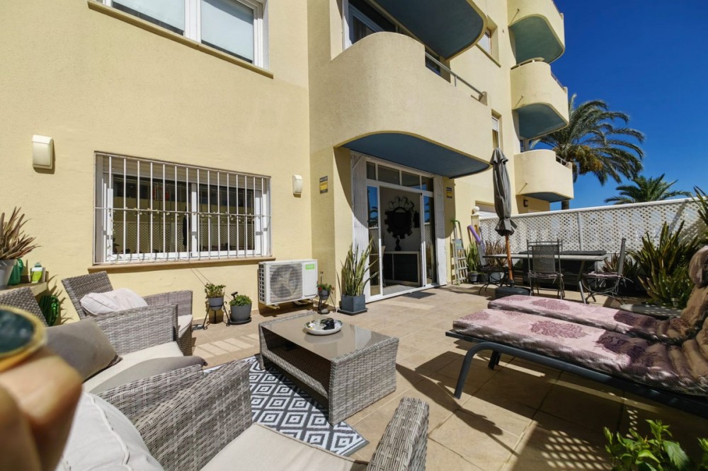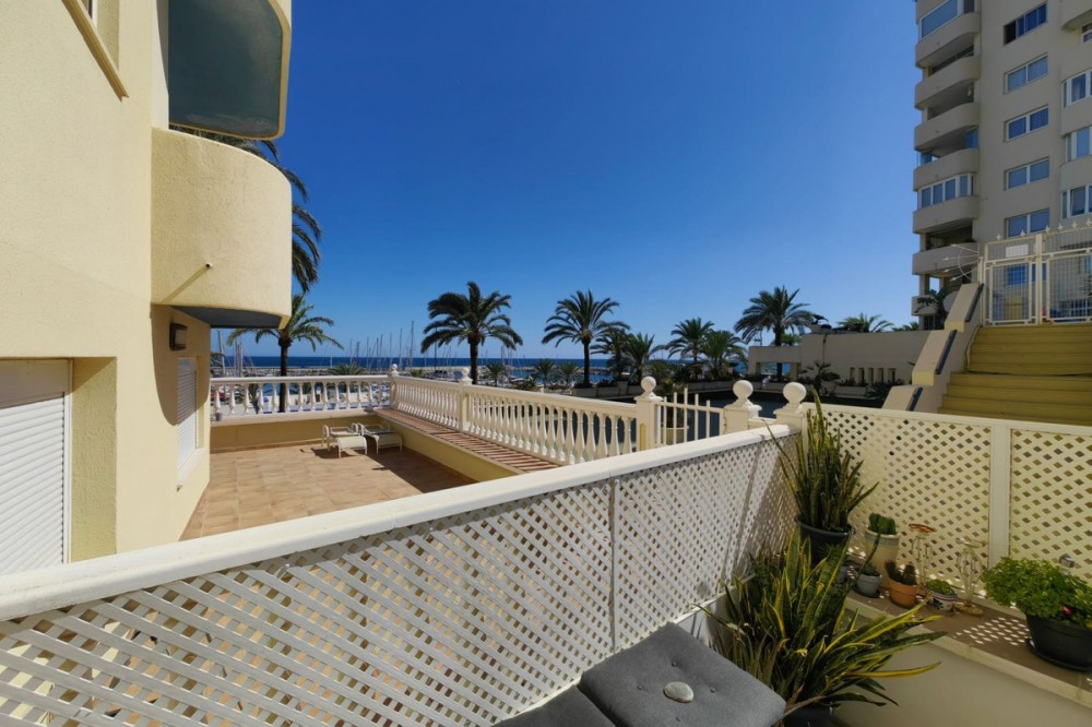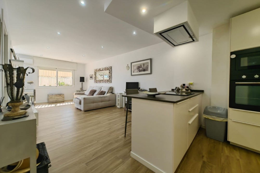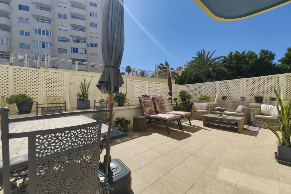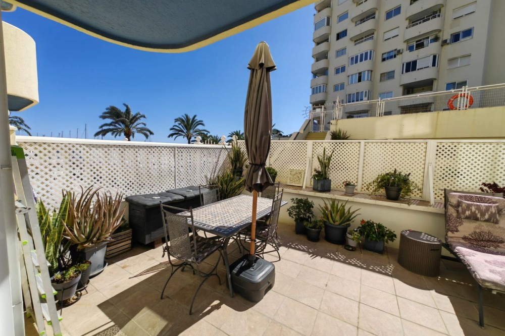 - Ground Floor Apartment with Large Terrace in Puerto Paraíso, Estepona Discover this beautifully reformed 1-bedroom ground floor apartment in the highly sought-after Puerto Paraíso urbanisation, located in the very heart of the Port and Marina of Estepona. This is a rare opportunity to own a frontline marina apartment with easy access for everyone, including those requiring wheelchair access. The apartment features a stylish open-plan kitchen with a breakfast counter, flowing seamlessly into the bright lounge and dining area. From here, large glass doors open onto an impressive 45 m² private terrace, perfect for outdoor living, with a lounge area, sunbeds, and views of the surrounding greenery. The bedroom is complemented by a modern bathroom with a walk-in shower with glass sliding doors and a wall-mounted toilet. Every detail has been carefully renovated to the highest contemporary standards, including a fully fitted kitchen with quality appliances. Additional features include: Hot and cold air-conditioning Private storeroom Free community parking within the gated complex With its unbeatable location, modern finishes, and expansive outdoor space, this is an ideal turnkey home to enjoy all that Estepona has to offer—just steps away from the marina, restaurants, and the beach