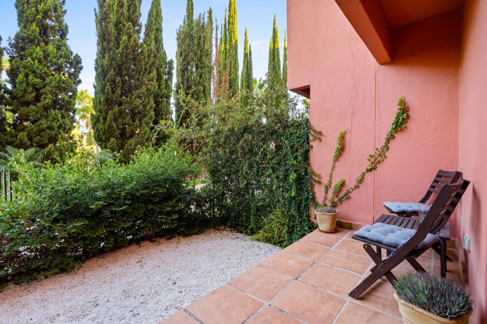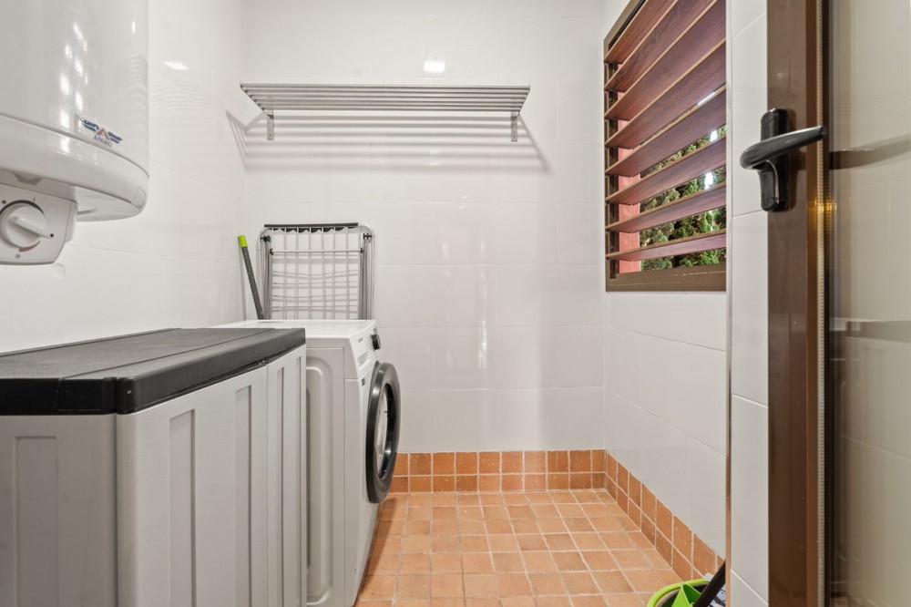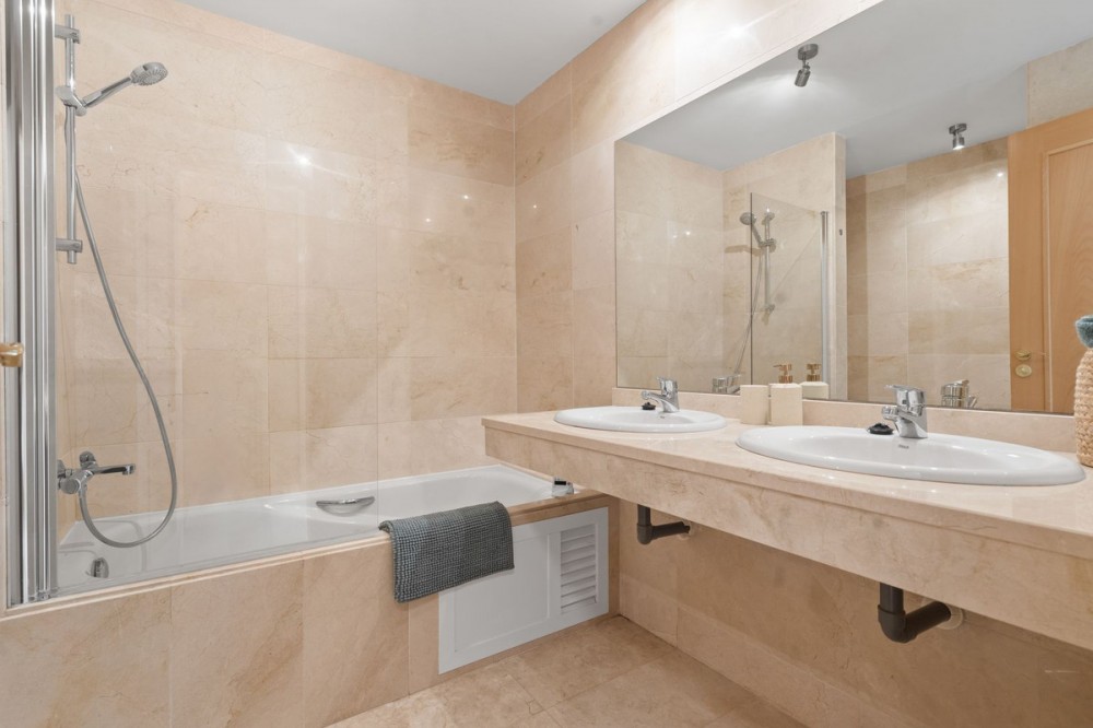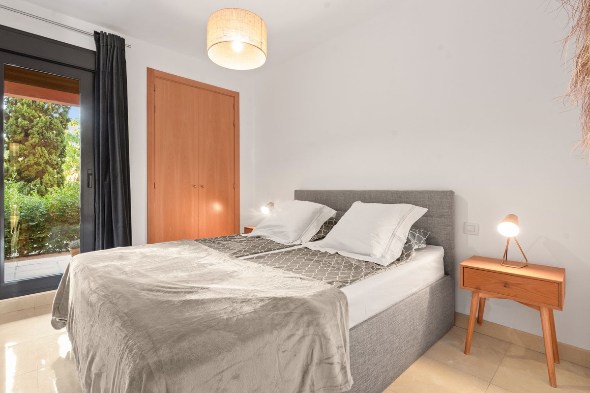 - Ground Floor Apartment for Sale in the New Golden Mile Discover the perfect coastal retreat in this spacious ground floor apartment located on the sought-after New Golden Mile, just a stone's throw from the beach(100 meters). With a generous total area of 163 m², this property features two well-appointed double bedrooms and two large bathrooms, making it ideal for families or those seeking extra space. The exquisite living and dining room opens to two semi-covered terraces, perfect for enjoying the Mediterranean climate. Step outside to your private garden, complete with a staircase leading to lush communal tropical gardens. Enjoy the luxury of outdoor saltwater swimming pools and a range of complex amenities, including a gym, sauna, jacuzzi, and a large heated indoor pool. The apartment also includes a spacious kitchen, laundry room, and ample storage in the basement, along with a private garage space for your convenience. With a fantastic orientation to the east, this apartment is bathed in natural light throughout the day. Additional features include electric central heating, air conditioning, and built-in wardrobes. Located in a well-maintained urbanization with plenty of parking spaces outside, this property is a perfect blend of comfort and luxurity.