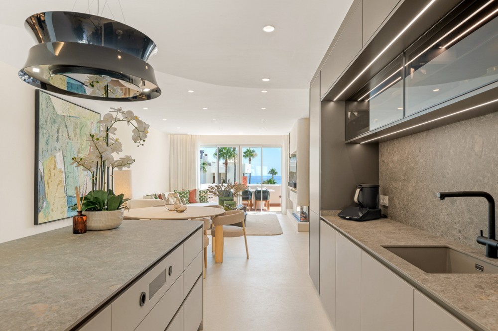 - Experience the ultimate in Mediterranean living with this stunning beachfront penthouse, located in the prestigious Bahía del Velerín community between Marbella and Estepona. Designed to the highest standards, this exclusive residence combines elegance, comfort, and breathtaking sea views in one of the Costa del Sol’s most sought-after areas. Bahía del Velerín offers residents a truly privileged lifestyle, with direct beach access, a beautiful pool area complete with a charming snack bar, and lush tropical gardens that create a serene, resort-style atmosphere. The community also provides 24/7 security, ensuring privacy and peace of mind. Inside the penthouse, you’ll find an expansive living room and a luxurious master bedroom, both opening onto spectacular, views of the Mediterranean Sea. An elegant electric fireplace adds a touch of modern sophistication, while large windows flood the interiors with natural light. The highlight of this property is the private rooftop terrace, an oasis designed for relaxation and entertaining. Whether enjoying morning coffee with the sunrise or hosting friends against the backdrop of the glittering coastline, this outdoor space makes every moment unforgettable. Perfectly positioned between Marbella and Estepona, the penthouse combines beachfront tranquility with proximity to world-class dining, golf courses, and luxury amenities, making it an ideal choice for a permanent residence, holiday retreat, or investment opportunity.