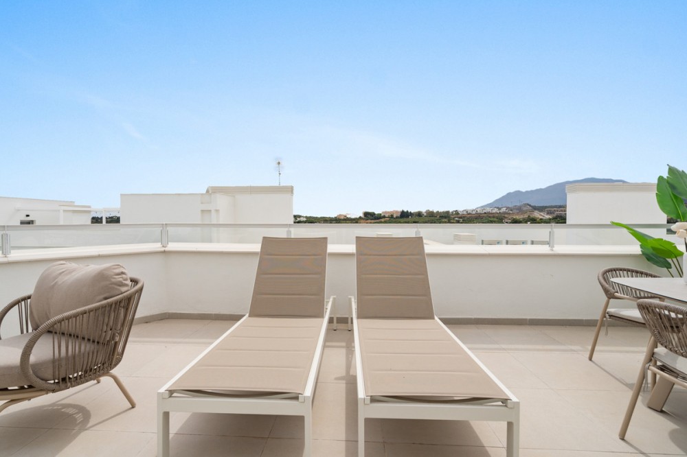 - Experience luxury coastal living in this stunning 3-bedroom penthouse located in the sought-after Oceana Gardens, Estepona. Designed with comfort and style in mind, the home features an elegant open-plan kitchen, two bathrooms including a private en-suite, and comes fully furnished for immediate enjoyment. The property also benefits from a rental license, making it an excellent opportunity for both personal use and investment. Step outside onto the generous 32m² west-facing terrace, the perfect setting to unwind, enjoy beautiful mountain views, and take in spectacular sunsets. Residents of Oceana Gardens enjoy an excellent selection of on-site amenities, including an outdoor swimming pool and gym. In addition, owners have exclusive access to the community’s prestigious club house, offering a luxurious indoor pool, spa, gym, and a restaurant, creating a true resort-style living experience. Ideally situated just 10 minutes from both Estepona and Marbella, this penthouse offers the perfect blend of tranquility, convenience, and Mediterranean charm. An exceptional home in a prime location—ideal for living, renting, and enjoying the best of the Costa del Sol